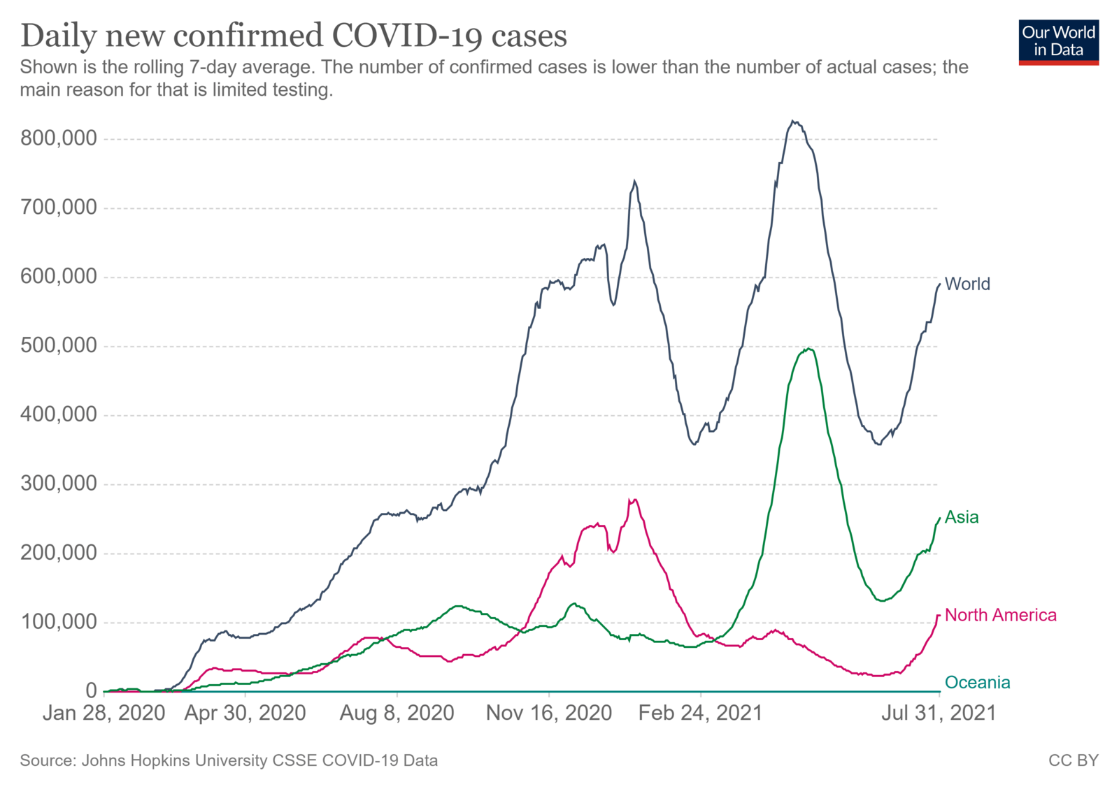 На початок серпня 2021 року загальна тенденція виявленості випадків коронавірусної інфекції у світі відображає ріст. В розрізі регіонів світу середнє семиденне свідчить про тенденцію до росту в Азії та Північній Америці, дещо у Африці, усі інші регіони поки що зберігають динаміку до спаду чи стабілізації. Аналогічні тенденції і щодо підтверджених випадків смертності від коронавірусної інфекції в регіонах світу.