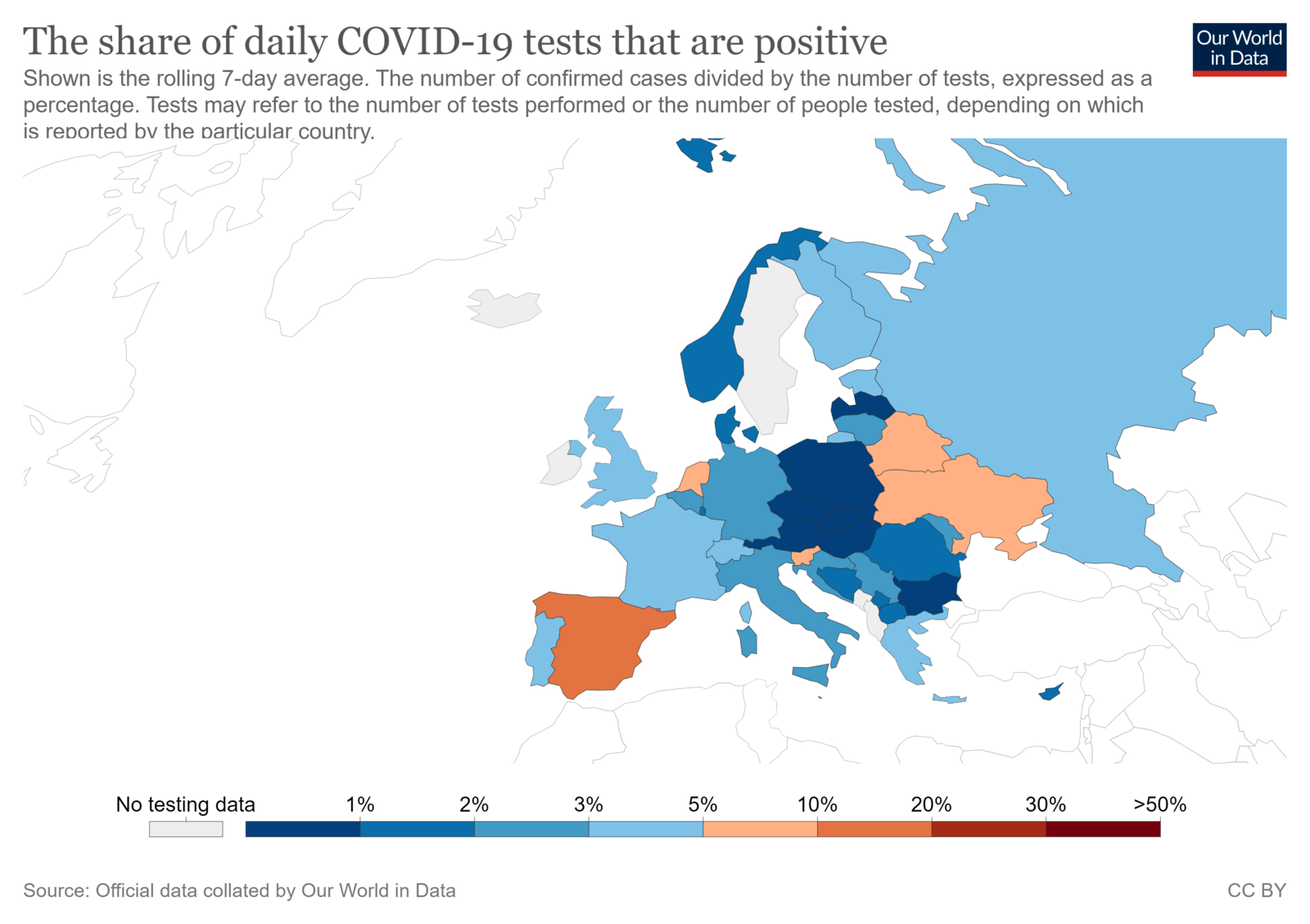 Збільшення виявленості випадків коронавірусної інфекції в країнах Європи за останні два тижні в порівнянні із попередніми склав ріст більше 100% у Ісландії, Чорногорії, Литві, Франції, Албанії, Італії, Естонії, Північній Македонії, Румунії, Болгарії, Швейцарії, Сербії, Австрії. Ріст випадків в Україні склав 18%. При цьому почала рости частка позитивних випадків серед усіх протестованих (нагадаємо, за рекомендаціями ВООЗ вона не повинна перевищувати 5%). Так у Іспанії уже 14.7% позитивних тестів серед усіх проведених тестувань, у Нідерландах 8%, в Україні 6.7%, Словенії і Білорусії 5.8%.