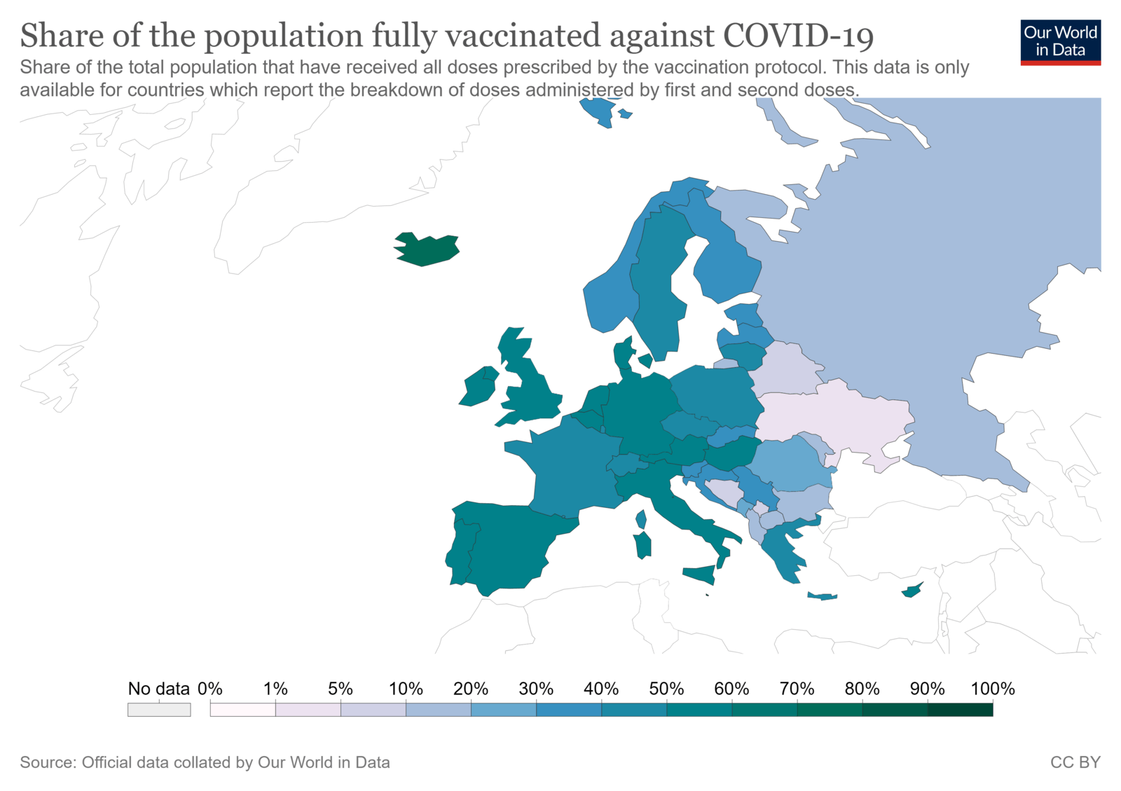 У Європейському Союзі частка повністю вакцинованих склала 48.88%. Так, більшість країн Європи охопили половину свого населення — Іспанія 57.61%, Бельгія 57.21%, Угорщина 56.2%, Великобританія 56.16%, Португалія 55.76%, Ірландія 55.6%, Данія 54.8%, Італія 52%, Німеччина 51.5%, Австрія 51%, Кіпр 50.6%, Нідерланди 50.52%, Греція 49.5. В Україні цей показник складає 4.63% населення повністю вакцинованого.