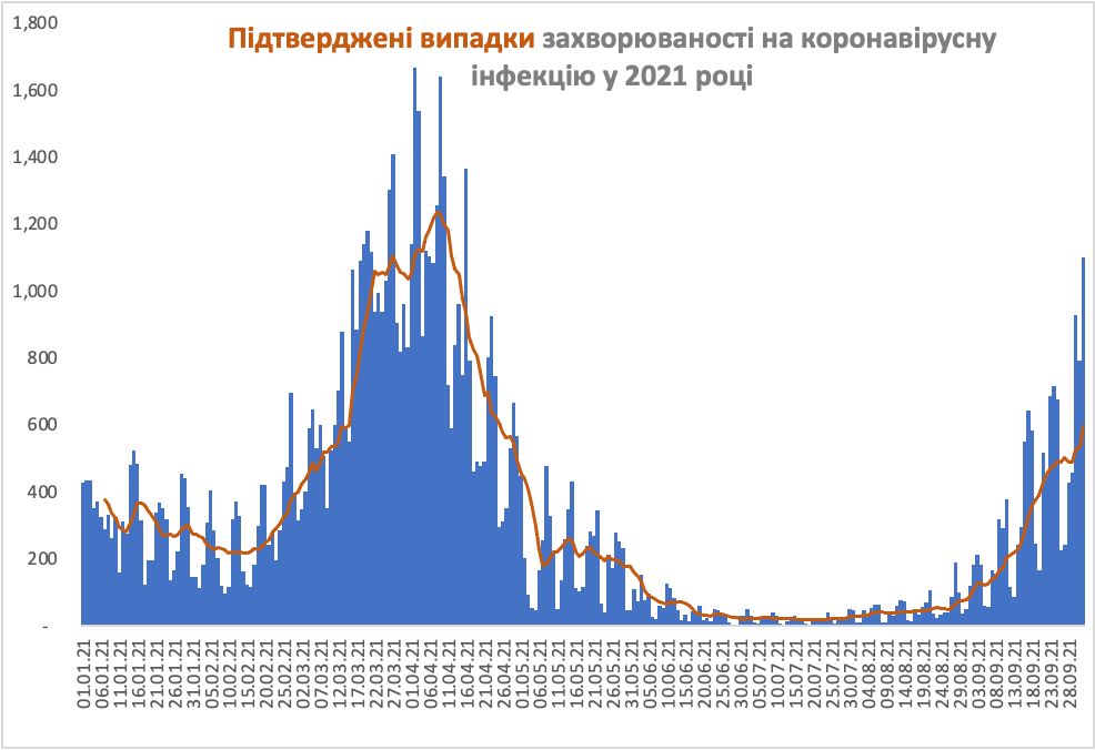 Поширення коронавірусної інфекції у Львівській області продовжує свій стрімкий ріст, перетнувши позначку у 1,1 тис. підтверджених випадків за добу в перші дні жовтня. Фактично, за місяць кількість виявлених випадків за добу зросла в десять разів: на початку вересня виявляли в середньому 100 випадків на день. Загалом за останній тиждень було виявлено 3750 нових випадків, або на 12% більше, ніж за попередній тиждень.