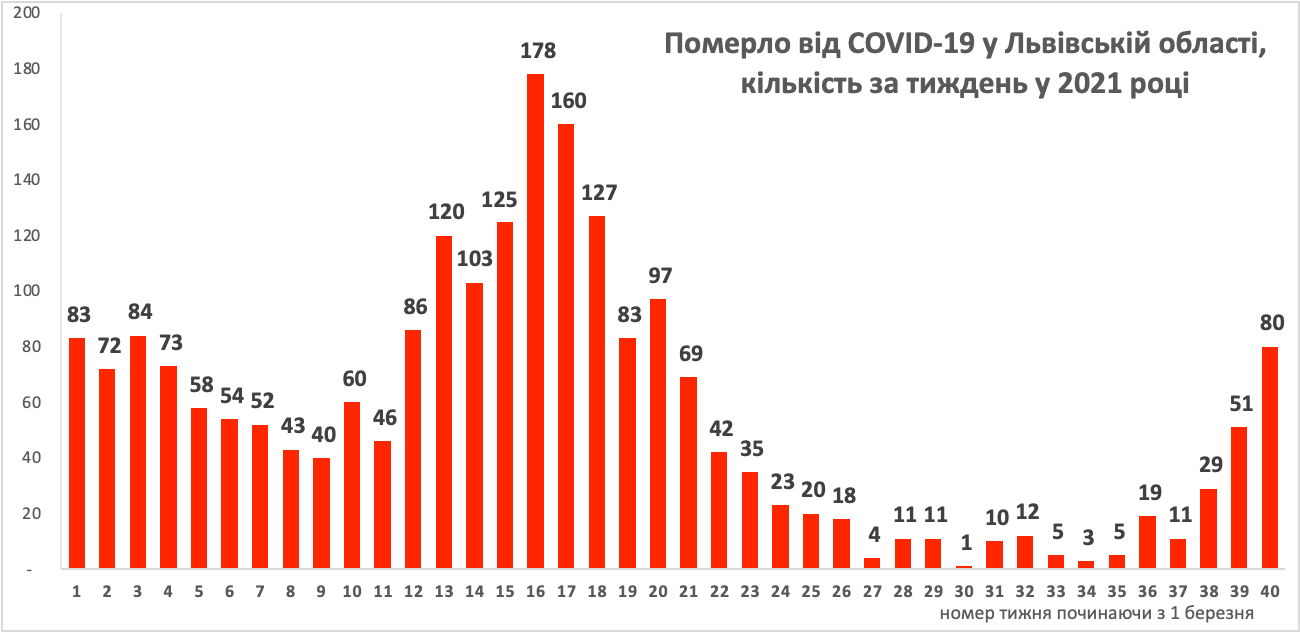Продовжує ріст і смертність: за останній тиждень зафіксовано 80 летальних випадків, спричинених коронавірусною інфекцією. Смертність теж зросла за місяць більш, ніж у 6 разів.