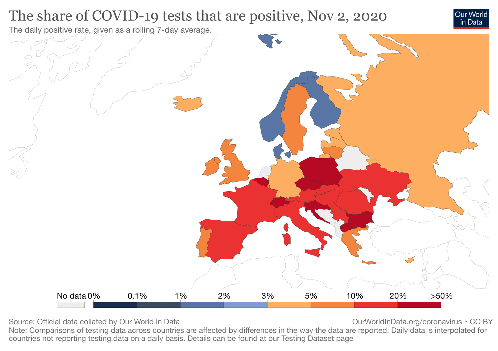 Найвищий відсоток позитивних тестів серед усіх протестованих за останній тиждень зафіксовано у Чехії — 32,6%, Словенії — 31,4%, Хорватії — 27,2%, Македонії — 26,5%, Польщі — 26,4%, Болгарії — 24.7%, Бельгії — 24.1%, Швейцарії — 23%, Італії — 21.7%. В Україні відсоток позитивних тестів минулого тижня становив 17.4%.