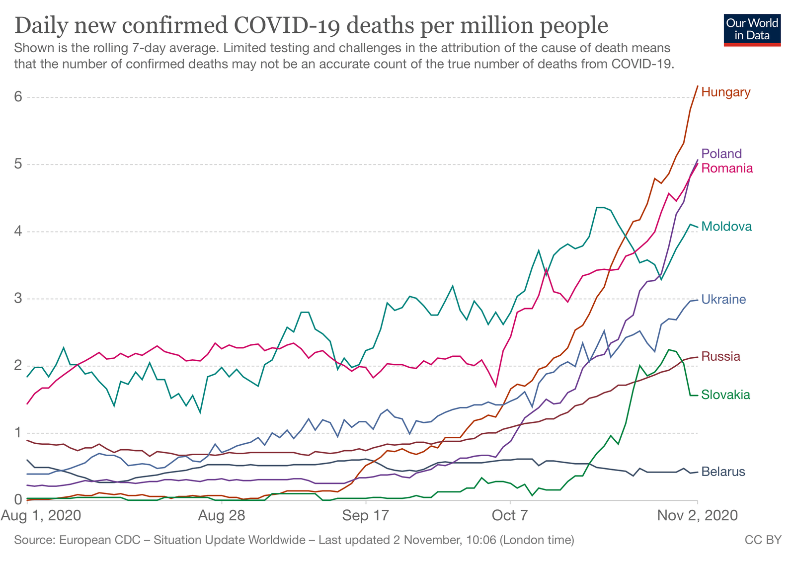 Аналогічна ситуація із смертністю, кількість відзвітованих випадків смертності від коронавірусної інфекції росте щотижня. Росія і Франція відзвітували про понад 2 тисячі смертей, Польща і Чехія — понад 1 тисячу, Україна — 915 (за попередній тиждень було відзвітовано про 718 смертельних випадків).