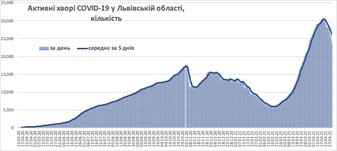 Кількість активно хворих почала спадати не так швидко, проте така вже тенденція проглядається: із пікового значення у 30 тис.активних випадків 17-20 квітня, Львівська область станом на 30 квітня має уже 23 тисячі активно хворих (зменшення практично на третину за останні 10 днів).