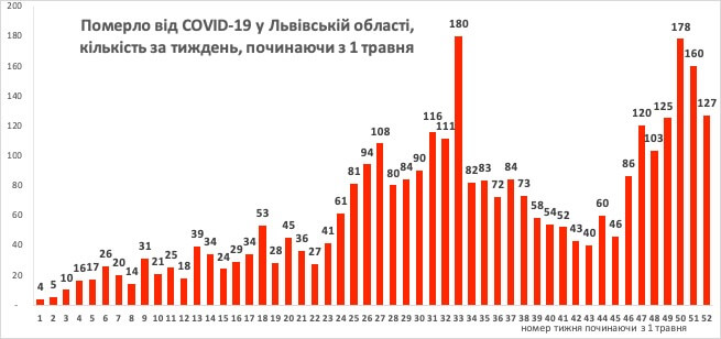 Смертність дещо зменшилась також, проте ще залишається на високому рівні. За останній тиждень було прозвітовано про 127 смертельних випадків від коронавірусної інфекції, це дещо менше ніж у попередні тижні, проте все ще досить високий показник. Так, впродовж двох днів цього тижня померлих було по 30 випадків за кожну добу. Якщо порівняти період епідемії до листопада 2020 року, то така кількість могла бути за тиждень, а зараз це значення за добу.