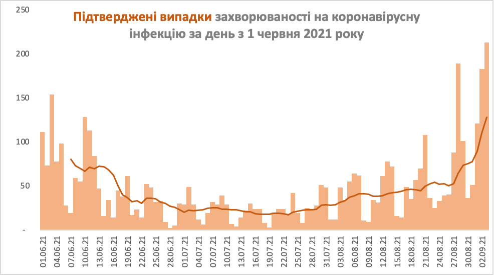 Вперше за період з початку літа, з 1 червня 2021 року, кількість денних випадків почала сягати, а 3 вересня 2021року навіть перевищила, 200 нових виявлених випадків коронавірусної інфекції. Найвищі тижневі значення склали на останньому тижні 894 нових виявлених випадки, що сягає рівня травня 2021 року.
