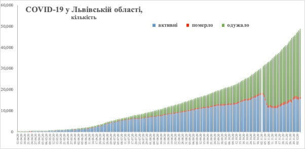 Пропорційна кількість осіб, що одужали, залишається значною: практично увесь листопад і початок грудня спостерігається перевищення тих, хто одужав, над активно хворими (станом на 4 грудня — 15 548 активно хворих і 31 946 осіб, що одужали).