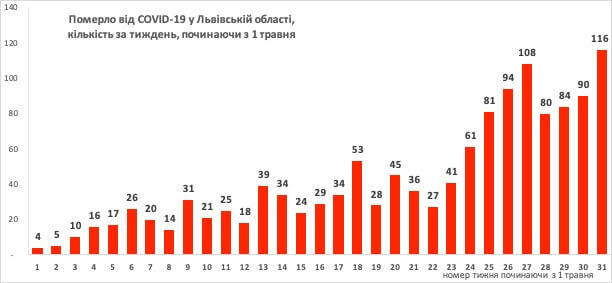 Офіційно відзвітована смертність зростає: 116 смертей від коронавірусної інфекції — це найвище значення за тиждень з травня, при тому, що залишається ймовірність недовиявлених смертей від коронавірусу.