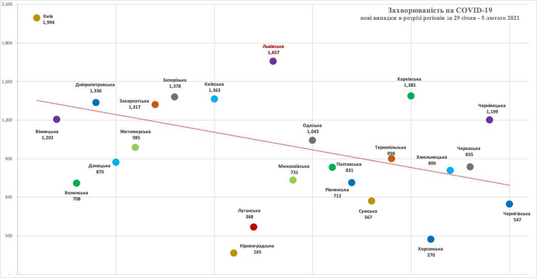 За період з минулої п’ятниці (з 29 січня по 5 лютого) в абсолютному вимірі у Львівській області виявлено найбільше випадків коронавірусної інфекції (1657 осіб) після м. Києва (1994). Найменше випадків за цей період виявлено у Кіровоградській (165) та Херсонській областях (270).