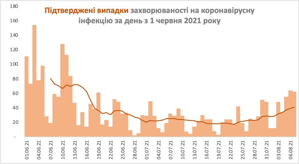 Динаміка поширення коронавірусної інфекції у серпні 2021 року має тенденцію до росту, хоча рівень виявленості все ще залишається невисоким в порівнянні із піковими значеннями під час попередніх спалахів. Так, у липні середньоденна кількість підтверджених випадків складала 24 в день, а вже за перший тиждень серпня було в середньому 41 випадок за день.