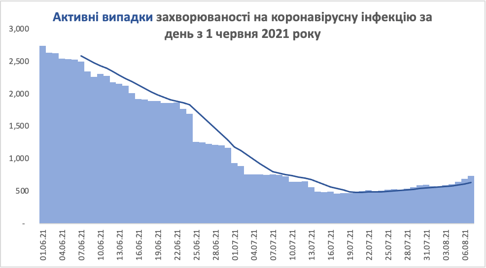 Відповідно відчутна тенденція росту кількості активних випадків: якщо до середини липня тенденція була до зменшення, то починаючи з 20-х чисел липня відбувається ріст, хоч поки і незначними темпами. Для порівняння, 17 липня 2021 року було 464 активні випадки, а уже 7 серпня — 731.