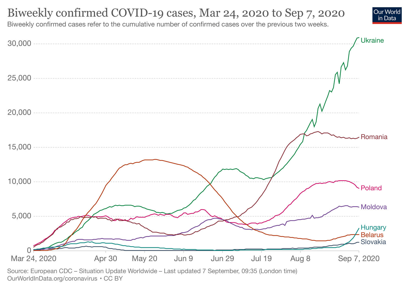 Ще більш негативна тенденція прослідковується, якщо аналізувати двотижневий ріст кількості випадків: Україна стрімко набирає обертів.