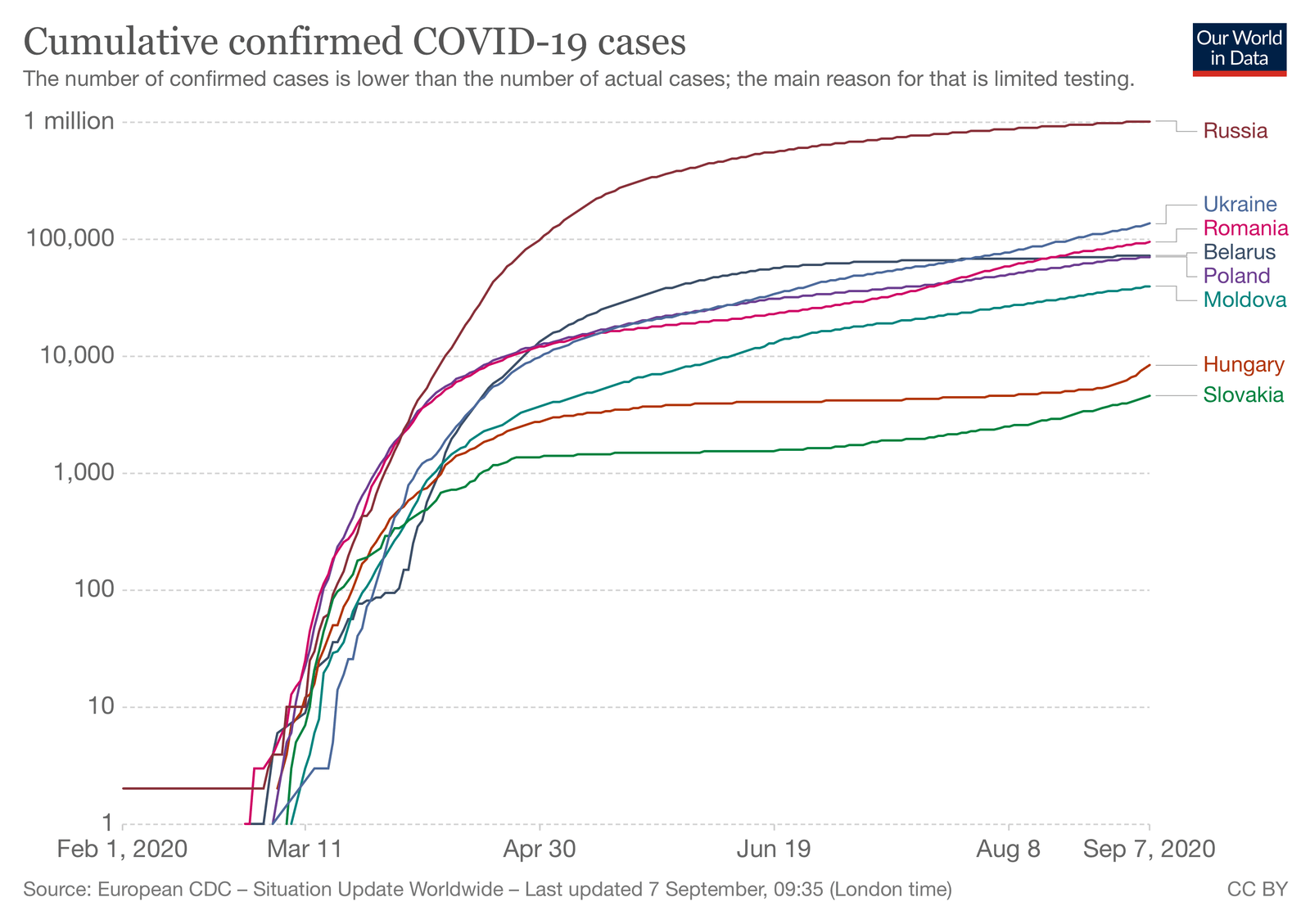 Темпи наростання кількості випадків в Україні, порівняно з сусідами, є найвищими після Росії, логарифмічний графік вказує на тенденцію подальшого росту захворюваності.