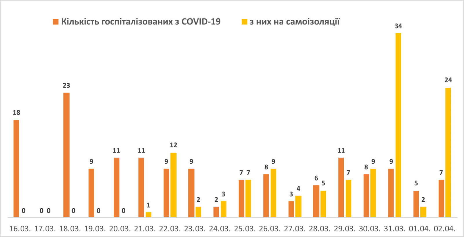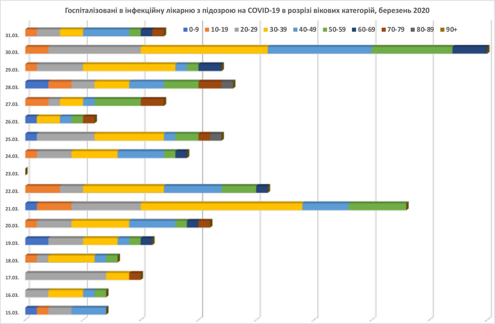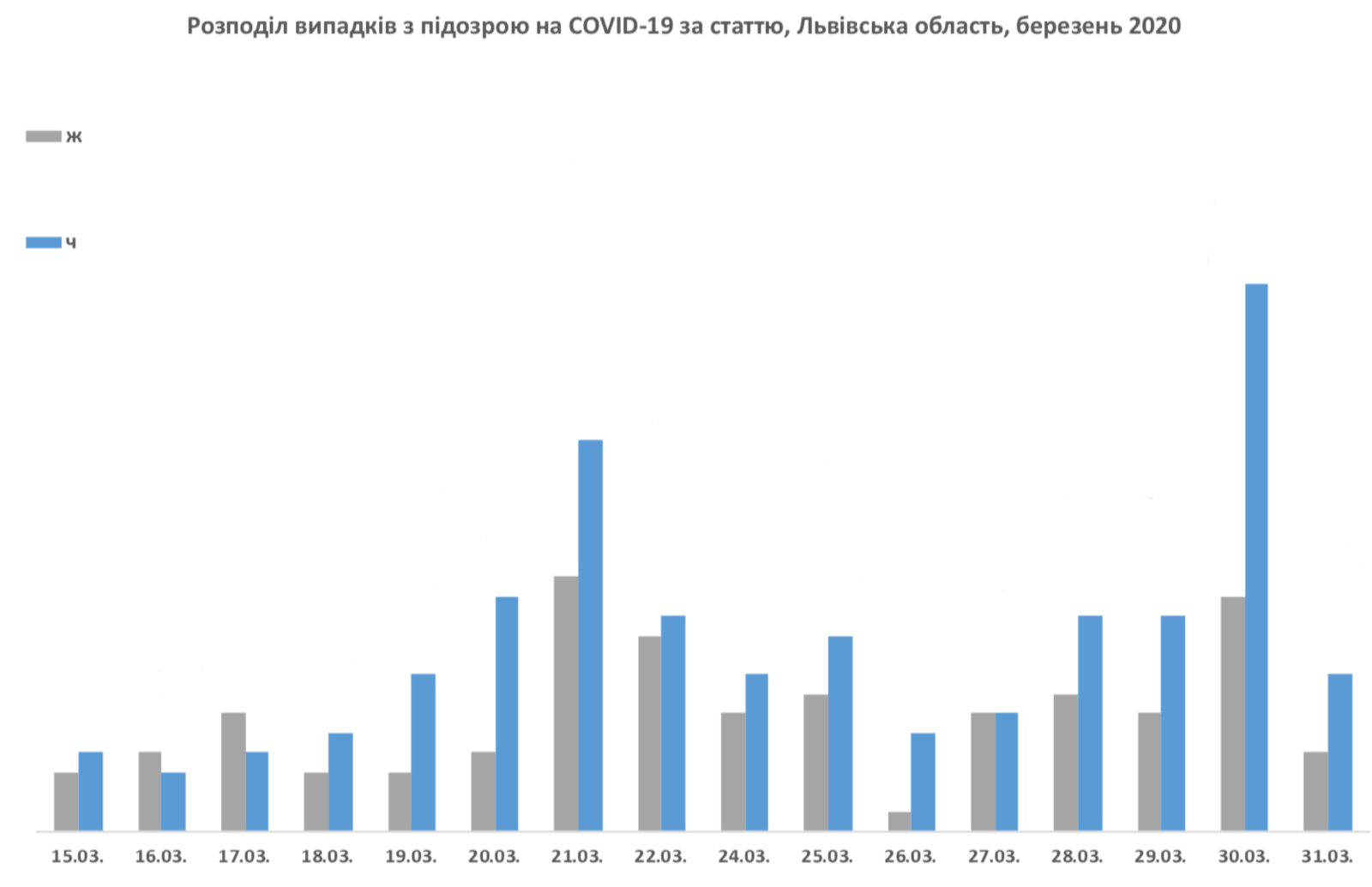 В період з 15 по 31 березня 2020 року з підозрою на COVID-19 до Львівської обласної інфекційної клінічної лікарні звернулось 276 мешканців Львівської області, з них було госпіталізовано 156 осіб, на амбулаторному лікуванні/самоізоляції — 119 осіб.