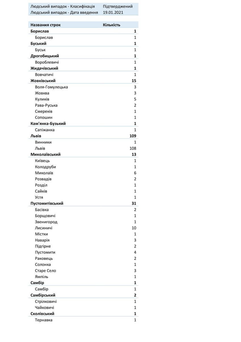 У стаціонарах області лікують 1212 пацієнтів із Covid-19, з них: у Львівській обласній інфекційній лікарні — 94, у Центрі легеневого здоров’я — 88, у Львівському обласному госпіталі ветеранів воєн та репресованих — 109, у Львівській обласній дитячій клінічній лікарні «ОХМАТДИТ» — 10, у ОКЛ — 22, у ЛШМД — 213, у 1 МКЛ — 49, у 5 МКЛ — 52, у 8 МКЛ — 69, у 1-му пологовому будинку — 7, у Львівській клінічній лікарні на ЗТ філії «ЦОЗ» АТ «Укрзалізниця» — 19, у Стрийській міській лікарні — 60, у Стебницькій міській лікарні — 41, у Рудківській лікарні — 34, у Новояворівській РЛ № 1 імені Юрія Липи — 68, у Кам’янка-Бузькій ЦРЛ — 26, у Сокальській ЦРЛ — 26, у Жовківській ЦРЛ — 27, у Жидачівській ЦРЛ — 36, у Самбірській ЦРЛ — 30, у Буській ЦРЛ — 37, у Пустомитівській ЦРЛ — 38, у Перемишлянській ЦРЛ — 57.