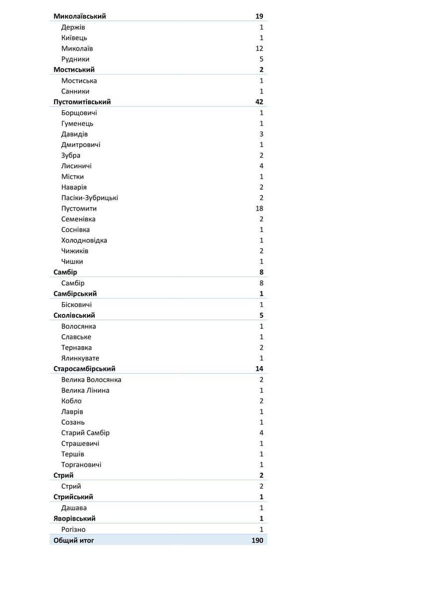 Знаходиться хворих в стаціонарах 1465, з них: у Львівській обласній інфекційній лікарні — 115, у Центрі легеневого здоров’я — 162, у Львівському обласному госпіталі ветеранів воєн та репресованих — 124, у Львівській обласній дитячій клінічній лікарні «ОХМАТДИТ» — 10, у ОКЛ — 37, у ЛШМД — 208, у 1 МКЛ — 75, у 5 МКЛ — 67, у 8 МКЛ — 91, у 1-му пологовому будинку — 11, у Львівській клінічній лікарні на ЗТ філії «ЦОЗ» АТ «Укрзалізниця» — 6, у Стрийській міській лікарні — 65, у Стебницькій міській лікарні — 37, у Рудківській лікарні — 49, у Новояворівській РЛ № 1 імені Юрія Липи — 104, у Кам’янка-Бузькій ЦРЛ — 50, у Сокальській ЦРЛ — 42, у Жовківській ЦРЛ — 36, у Жидачівській ЦРЛ — 41, у Самбірській ЦРЛ — 28, у Буській ЦРЛ — 37, у Пустомитівській ЦРЛ — 19, у Перемишлянській ЦРЛ — 51.