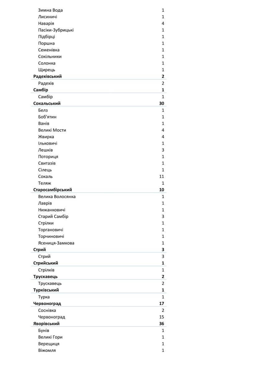 Знаходиться хворих в стаціонарах 1451, з них: у Львівській обласній інфекційній лікарні — 109, у Центрі легеневого здоров’я — 161, у Львівському обласному госпіталі ветеранів воєн та репресованих — 128, у Львівській обласній дитячій клінічній лікарні «ОХМАТДИТ» — 7, у ОКЛ — 34, у ЛШМД — 205, у 1 МКЛ — 69, у 5 МКЛ — 68, у 8 МКЛ — 79, у 1-му пологовому будинку — 10, у Львівській клінічній лікарні на ЗТ філії «ЦОЗ» АТ «Укрзалізниця» — 5, у Стрийській міській лікарні — 64, у Стебницькій міській лікарні — 42, у Рудківській лікарні — 48, у Новояворівській РЛ № 1 імені Юрія Липи — 101, у Кам’янка-Бузькій ЦРЛ — 47, у Сокальській ЦРЛ — 34, у Жовківській ЦРЛ — 36, у Жидачівській ЦРЛ — 42, у Самбірській ЦРЛ — 27, у Буській ЦРЛ — 37, у Пустомитівській ЦРЛ — 51, у Перемишлянській ЦРЛ — 47.