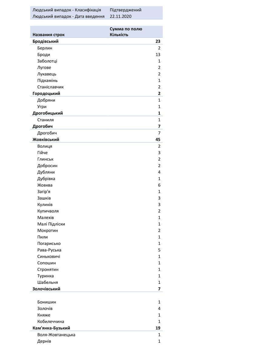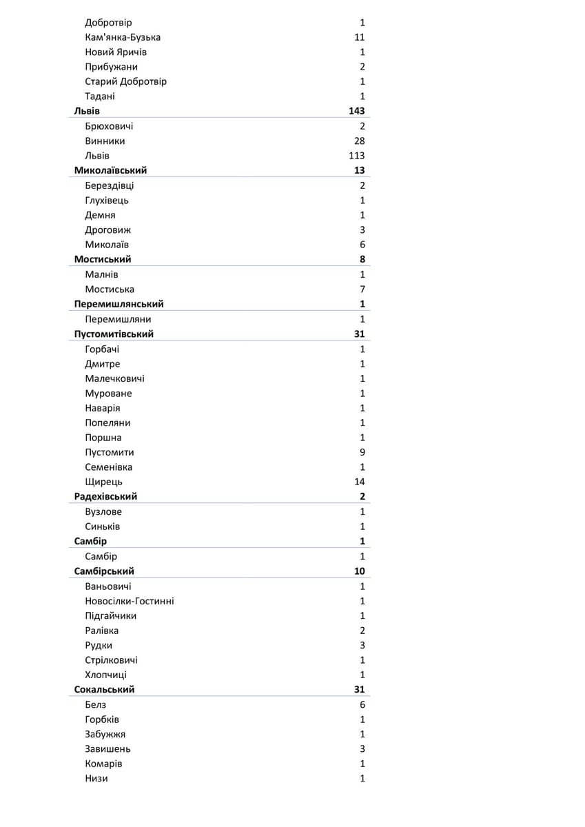 У стаціонарах — 1893 пацієнтів, з них: у Львівській обласній інфекційній лікарні — 154 у Центрі легеневого здоров’я — 170 у Львівському обласному госпіталі ветеранів воєн та репресованих — 173 у Львівській обласній дитячій клінічній лікарні «ОХМАТДИТ» — 11 у ОКЛ — 35 у ЛШМД — 268 у 1 МКЛ — 91 у 5 МКЛ — 101 у 8 МКЛ — 101 у 1-му пологовому будинку — 19 у Стрийській міській лікарні — 118 у Стебницькій міській лікарні — 78 у Рудківській лікарні — 66 у Новояворівській РЛ № 1 імені Юрія Липи — 120 у Кам’янка-Бузькій ЦРЛ — 58 у Сокальській ЦРЛ — 45 у Жовківській ЦРЛ — 43 у Жидачівській ЦРЛ — 48 у Самбірській ЦРЛ — 35 у Буській ЦРЛ — 46 у Пустомитівській ЦРЛ — 53 у Перемишлянській ЦРЛ — 60.