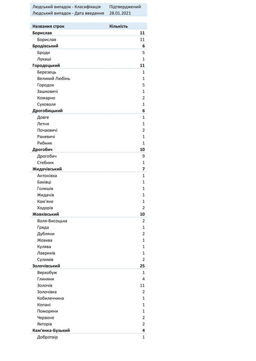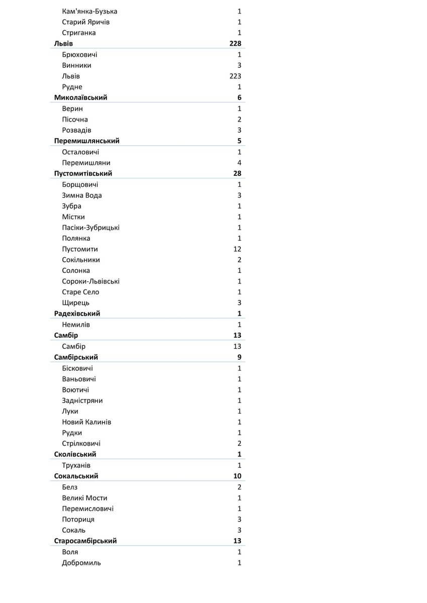 Знаходиться хворих в стаціонарах 1267, з них: у Львівській обласній інфекційній лікарні — 127, у Центрі легеневого здоров’я — 119, у Львівському обласному госпіталі ветеранів воєн та репресованих — 107 у Львівській обласній дитячій клінічній лікарні «ОХМАТДИТ» — 7, у ОКЛ — 25, у ЛШМД — 179, у 1 МКЛ — 55, у 5 МКЛ — 54, у 8 МКЛ — 45, у 1-му пологовому будинку — 4, у Львівській клінічній лікарні на ЗТ філії «ЦОЗ» АТ «Укрзалізниця» — 15, у Стрийській міській лікарні — 69, у Стебницькій міській лікарні — 61, у Рудківській лікарні — 44 у Новояворівській РЛ № 1 імені Юрія Липи — 72, у Кам’янка Бузькій ЦРЛ — 30, у Сокальській ЦРЛ — 32, у Жовківській ЦРЛ — 26, у Жидачівській ЦРЛ — 29, у Самбірській ЦРЛ — 41, у Буській ЦРЛ — 28, у Пустомитівській ЦРЛ — 46, у Перемишлянській ЦРЛ — 52.