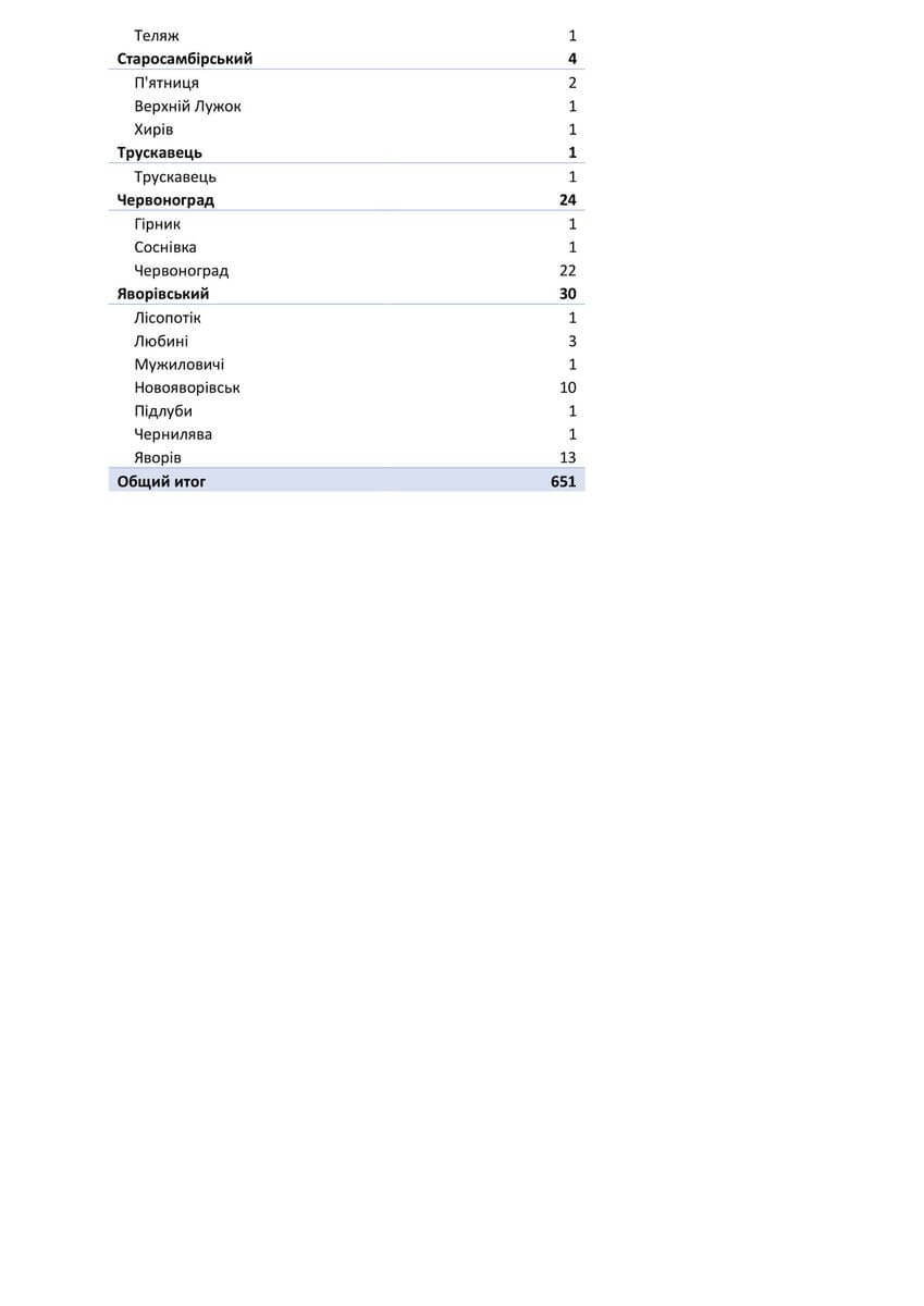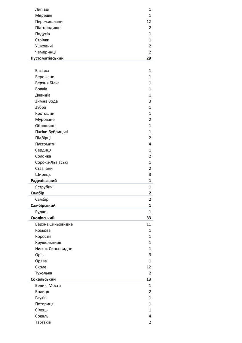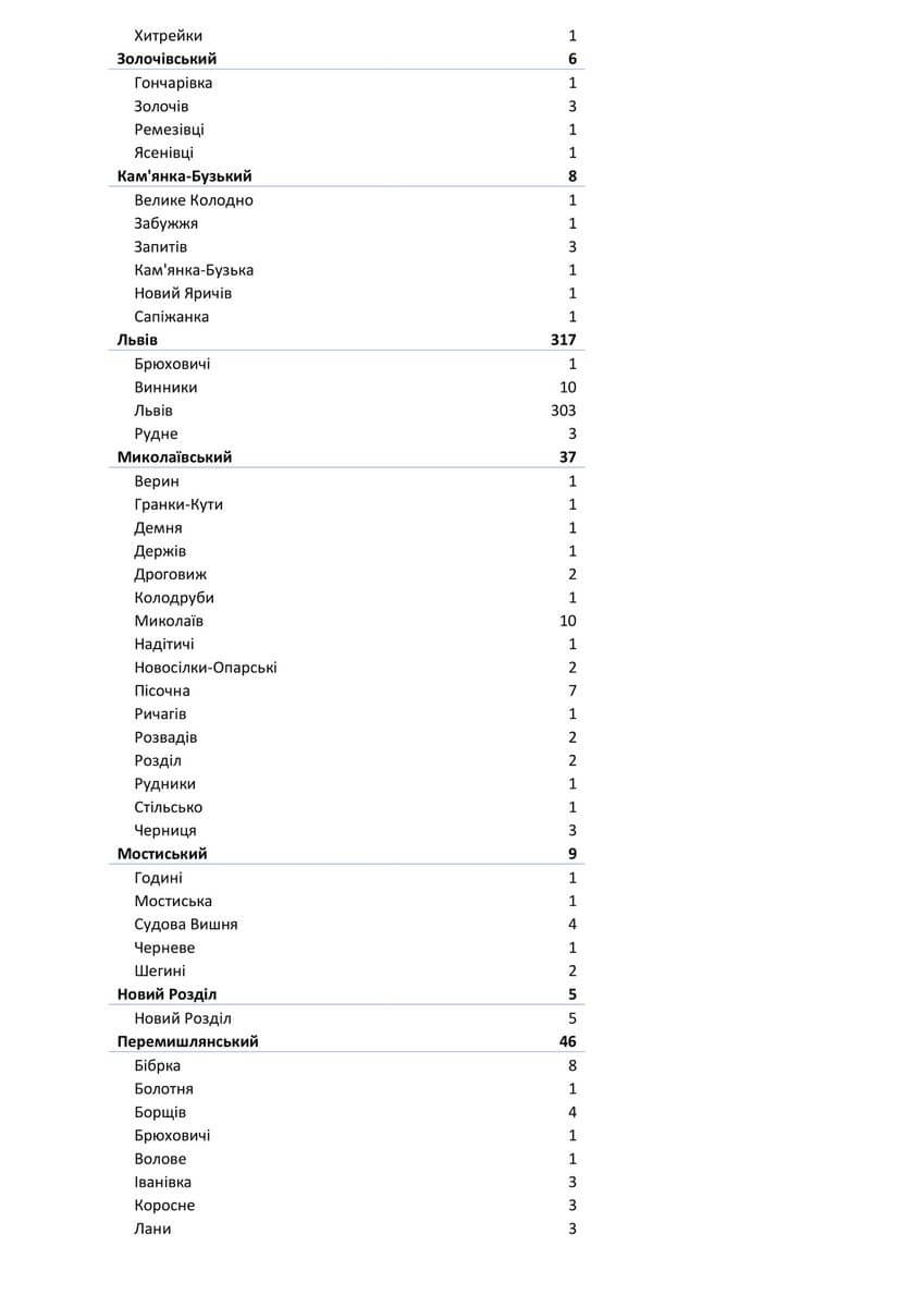 У стаціонарах — 1899 пацієнтів, з них: у Львівській обласній інфекційній лікарні — 153 у Центрі легеневого здоров’я — 147 у Львівському обласному госпіталі ветеранів воєн та репресованих — 184 у Львівській обласній дитячій клінічній лікарні «ОХМАТДИТ» — 10 у ОКЛ — 35 у ЛШМД — 259 у 1 МКЛ — 89 у 5 МКЛ — 93 у 8 МКЛ — 97 у 1-му пологовому будинку — 15 у Стрийській міській лікарні — 115 у Стебницькій міській лікарні — 91 у Рудківській лікарні — 72 у Новояворівській РЛ № 1 імені Юрія Липи — 121 у Кам’янка-Бузькій ЦРЛ — 57 у Сокальській ЦРЛ — 48 у Жовківській ЦРЛ — 56 у Жидачівській ЦРЛ — 46 у Самбірській ЦРЛ — 39 у Буській ЦРЛ — 47 у Пустомитівській ЦРЛ — 64 у Перемишлянській ЦРЛ — 61.