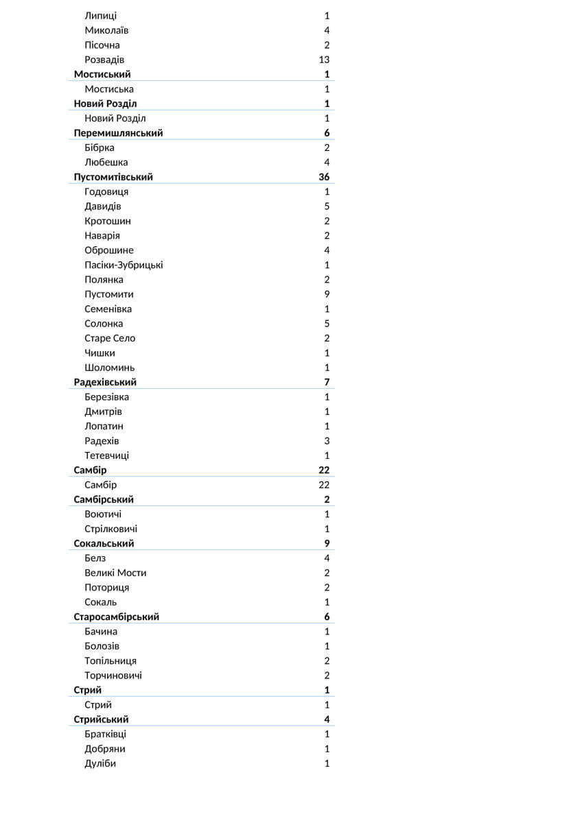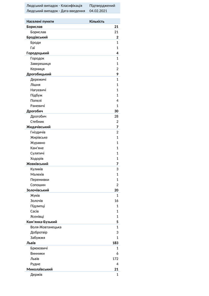 Знаходиться хворих в стаціонарах 1156, з них: у Львівській обласній інфекційній лікарні — 125, у Центрі легеневого здоров’я — 106, у Львівському обласному госпіталі ветеранів воєн та репресованих — 97, у Львівській обласній дитячій клінічній лікарні «ОХМАТДИТ» — 11, у ОКЛ — 31, у ЛШМД — 130, у 1 МКЛ — 48, у 5 МКЛ — 46, у 8 МКЛ — 51, у 1-му пологовому будинку — 3, у Львівській клінічній лікарні на ЗТ філії «ЦОЗ» АТ «Укрзалізниця» — 14, у Стрийській міській лікарні — 77, у Стебницькій міській лікарні — 61, у Рудківській лікарні — 39, у Новояворівській РЛ № 1 імені Юрія Липи — 61, у Кам’янка Бузькій ЦРЛ — 36, у Сокальській ЦРЛ — 12, у Жовківській ЦРЛ — 19, у Жидачівській ЦРЛ — 33, у Самбірській ЦРЛ — 46, у Буській ЦРЛ — 23, у Пустомитівській ЦРЛ — 44, у Перемишлянській ЦРЛ — 43.