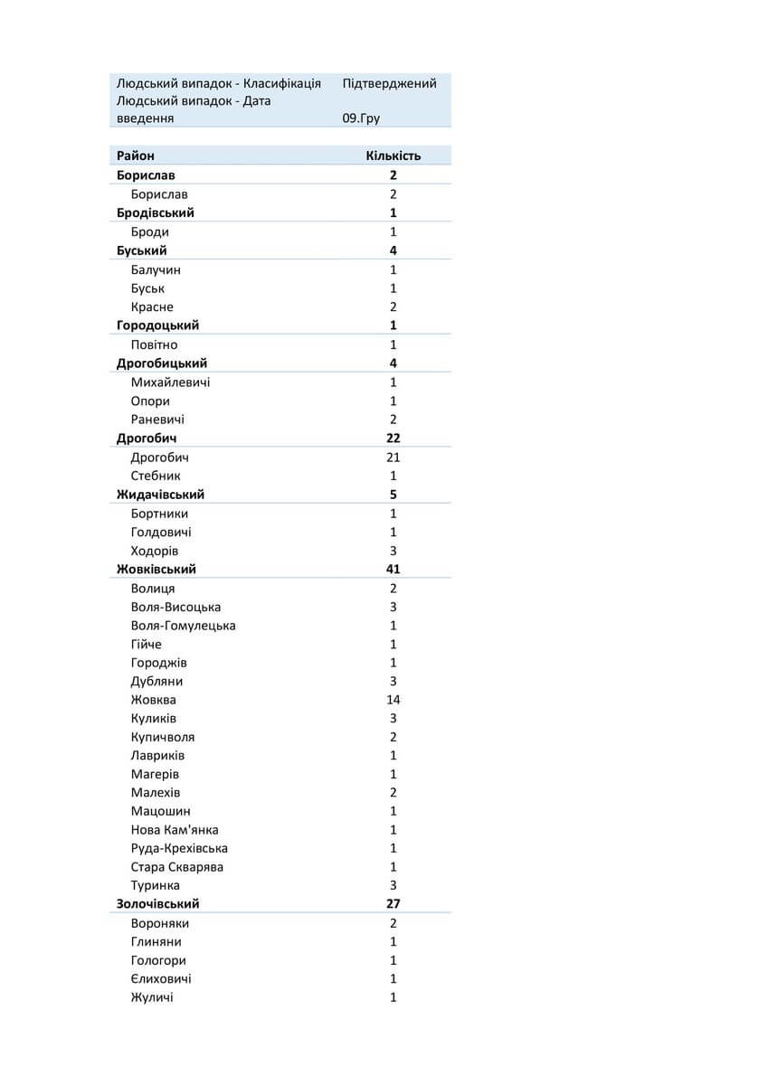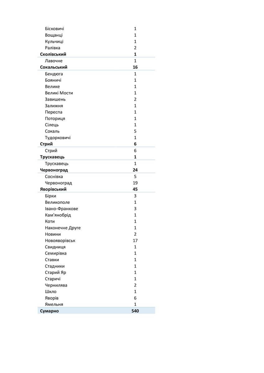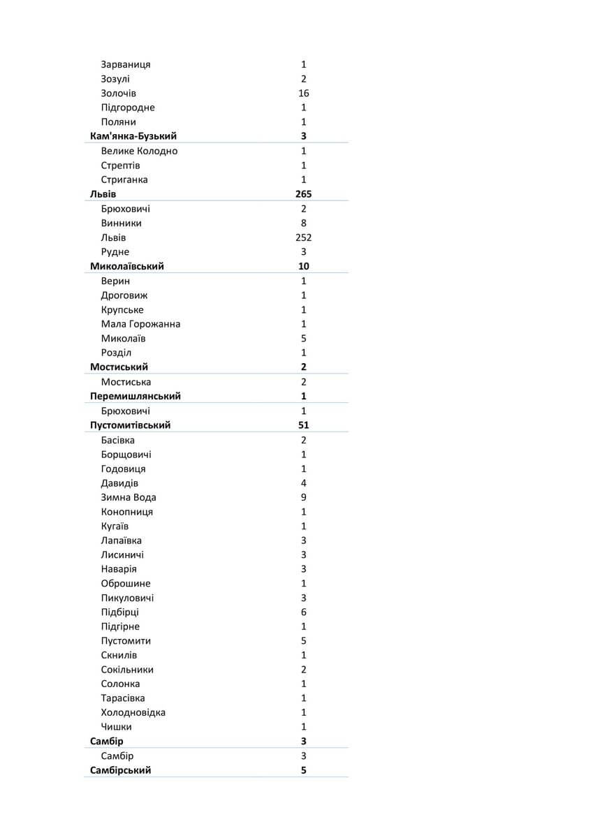 Знаходиться хворих в стаціонарах 1543, з них: у Львівській обласній інфекційній лікарні — 104 у Центрі легеневого здоров’я — 137 у Львівському обласному госпіталі ветеранів воєн та репресованих — 145, у Львівській обласній дитячій клінічній лікарні «ОХМАТДИТ» — 17, у ОКЛ — 33, у ЛШМД — 234, у 1 МКЛ — 83, у 5 МКЛ — 73, у 8 МКЛ — 103, у 1-му пологовому будинку — 11, у Стрийській міській лікарні — 89, у Стебницькій міській лікарні — 54, у Рудківській лікарні — 42, у Новояворівській РЛ № 1 імені Юрія Липи — 96, у Кам’янка-Бузькій ЦРЛ — 41, у Сокальській ЦРЛ — 43, у Жовківській ЦРЛ — 32, у Жидачівській ЦРЛ — 44, у Самбірській ЦРЛ — 27, у Буській ЦРЛ — 38, у Пустомитівській ЦРЛ — 43, у Перемишлянській ЦРЛ — 54.
