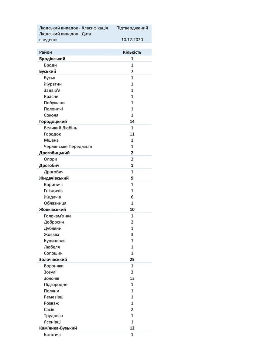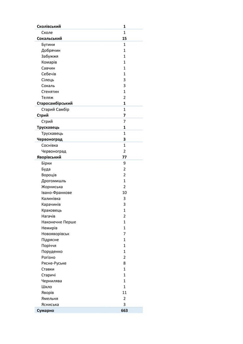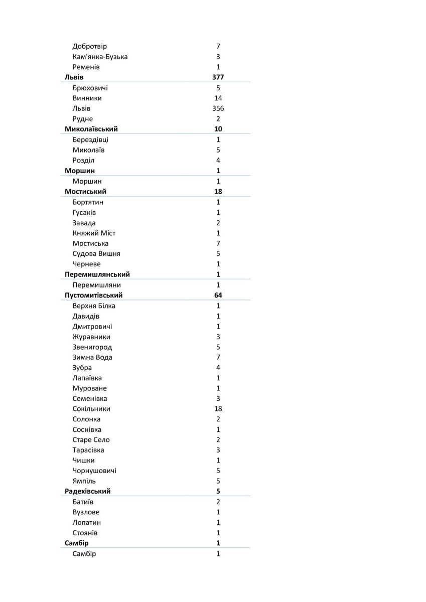 Знаходиться хворих в стаціонарах 1574, з них: у Львівській обласній інфекційній лікарні — 113, у Центрі легеневого здоров’я — 148, у Львівському обласному госпіталі ветеранів воєн та репресованих — 148, у Львівській обласній дитячій клінічній лікарні «ОХМАТДИТ» — 14, у ОКЛ — 37, у ЛШМД — 232, у 1 МКЛ — 83, у 5 МКЛ — 69, у 8 МКЛ — 100, у 1-му пологовому будинку — 12, у Стрийській міській лікарні — 84, у Стебницькій міській лікарні — 57, у Рудківській лікарні — 40, у Новояворівській РЛ № 1 імені Юрія Липи — 100, у Кам’янка-Бузькій ЦРЛ — 40, у Сокальській ЦРЛ — 47, у Жовківській ЦРЛ — 39, у Жидачівській ЦРЛ — 45, у Самбірській ЦРЛ — 28, у Буській ЦРЛ — 38, у Пустомитівській ЦРЛ — 43, у Перемишлянській ЦРЛ — 57.