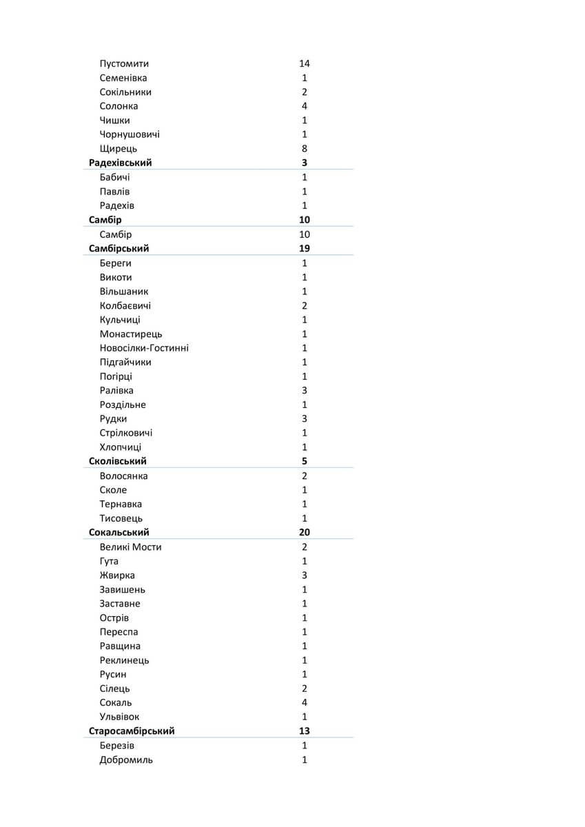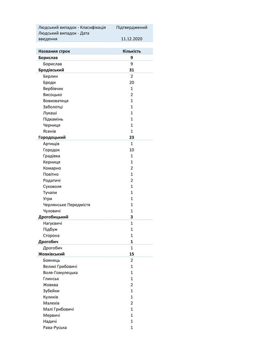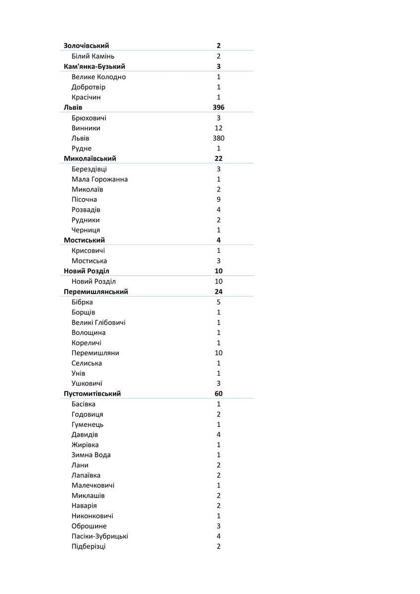 Знаходиться хворих в стаціонарах 1546, з них: у Львівській обласній інфекційній лікарні — 118, у Центрі легеневого здоров’я — 145, у Львівському обласному госпіталі ветеранів воєн та репресованих — 143, у Львівській обласній дитячій клінічній лікарні «ОХМАТДИТ» — 13, у ОКЛ — 35, у ЛШМД — 226, у 1 МКЛ — 84, у 5 МКЛ — 68, у 8 МКЛ — 97, у 1-му пологовому будинку — 10, у Стрийській міській лікарні — 79, у Стебницькій міській лікарні — 57, у Рудківській лікарні — 41, у Новояворівській РЛ № 1 імені Юрія Липи — 101, у Кам’янка-Бузькій ЦРЛ — 40, у Сокальській ЦРЛ — 41, у Жовківській ЦРЛ — 35, у Жидачівській ЦРЛ — 45, у Самбірській ЦРЛ — 29, у Буській ЦРЛ — 39, у Пустомитівській ЦРЛ — 46, у Перемишлянській ЦРЛ — 54.