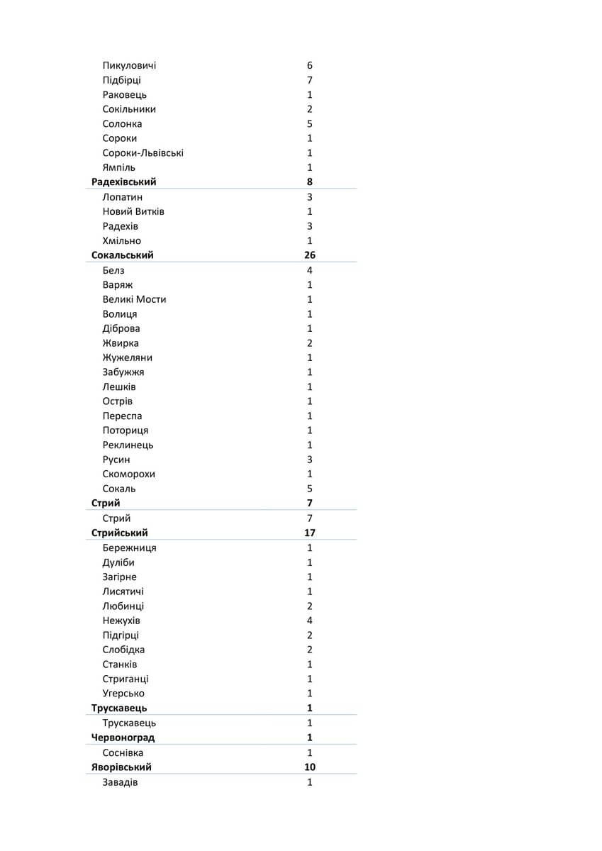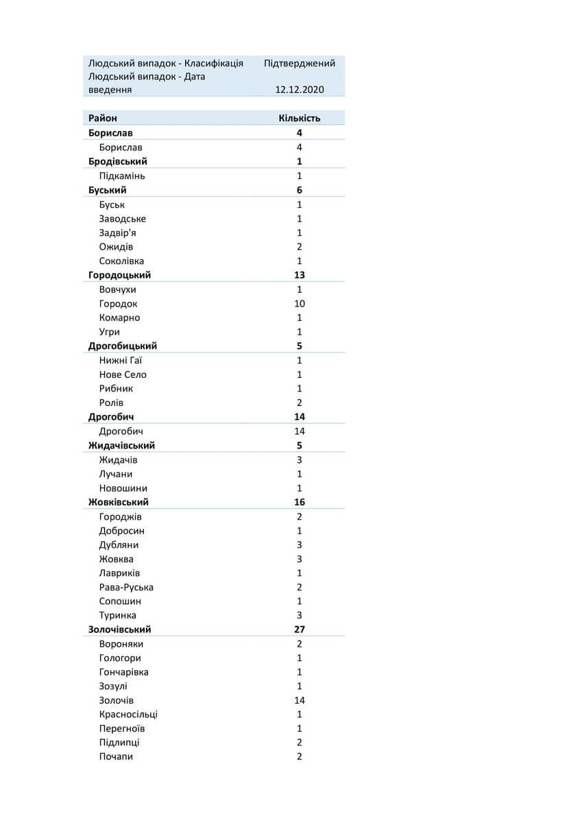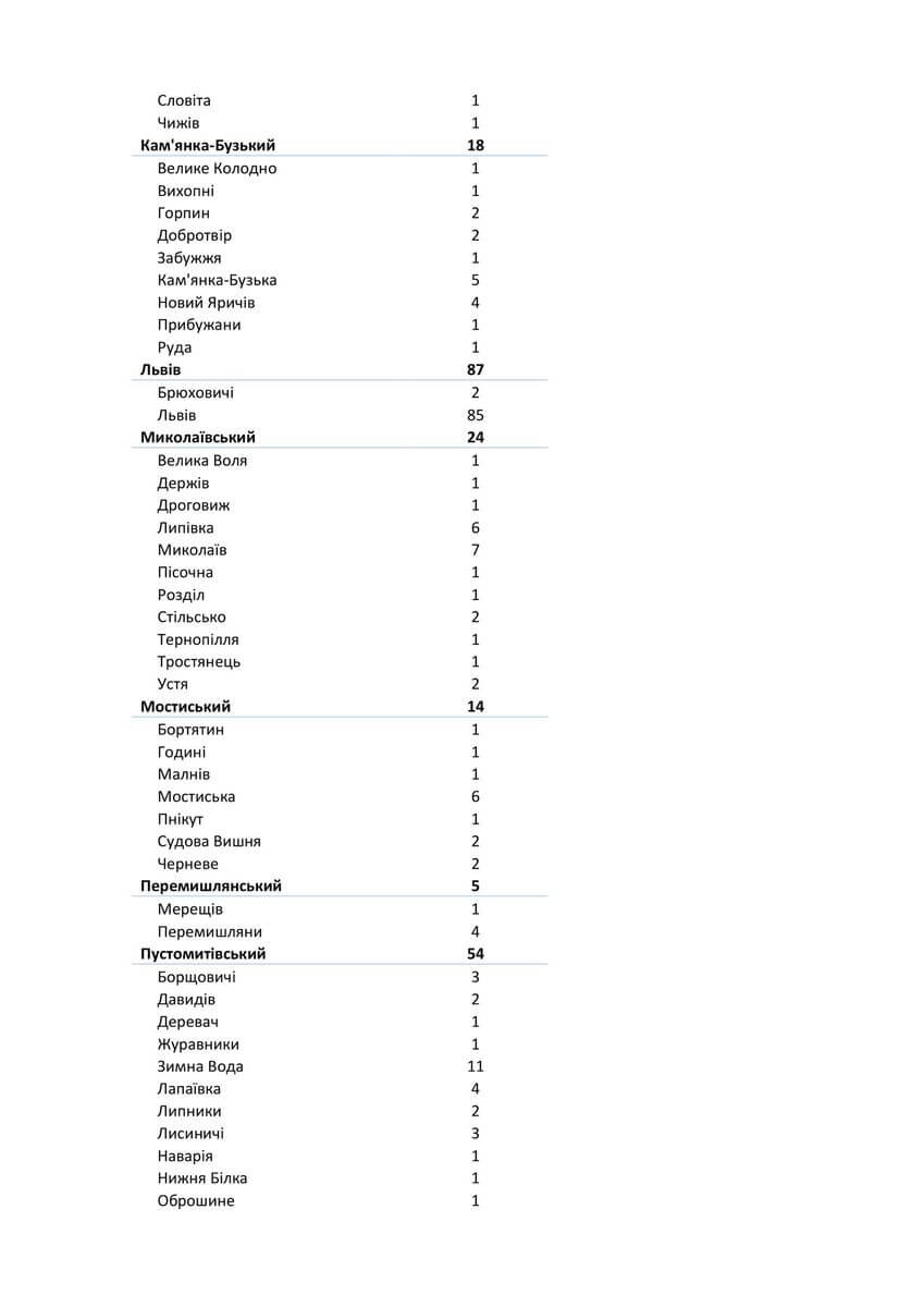 Знаходиться хворих в стаціонарах — 1574, з них: у Львівській обласній інфекційній лікарні — 125, у Центрі легеневого здоров’я — 153, у Львівському обласному госпіталі ветеранів воєн та репресованих — 146, у Львівській обласній дитячій клінічній лікарні «ОХМАТДИТ» — 14, у ОКЛ — 36, у ЛШМД — 224, у 1 МКЛ — 86, у 5 МКЛ — 69, у 8 МКЛ — 97, у 1-му пологовому будинку — 11, у Львівській клінічній лікарні на ЗТ філії «ЦОЗ» АТ «Укрзалізниця» — 1, у Стрийській міській лікарні — 79, у Стебницькій міській лікарні — 57, у Рудківській лікарні — 43, у Новояворівській РЛ № 1 імені Юрія Липи — 102, у Кам’янка-Бузькій ЦРЛ — 43, у Сокальській ЦРЛ — 42, у Жовківській ЦРЛ — 37, у Жидачівській ЦРЛ — 42, у Самбірській ЦРЛ — 30, у Буській ЦРЛ — 37, у Пустомитівській ЦРЛ — 46, у Перемишлянській ЦРЛ — 54.