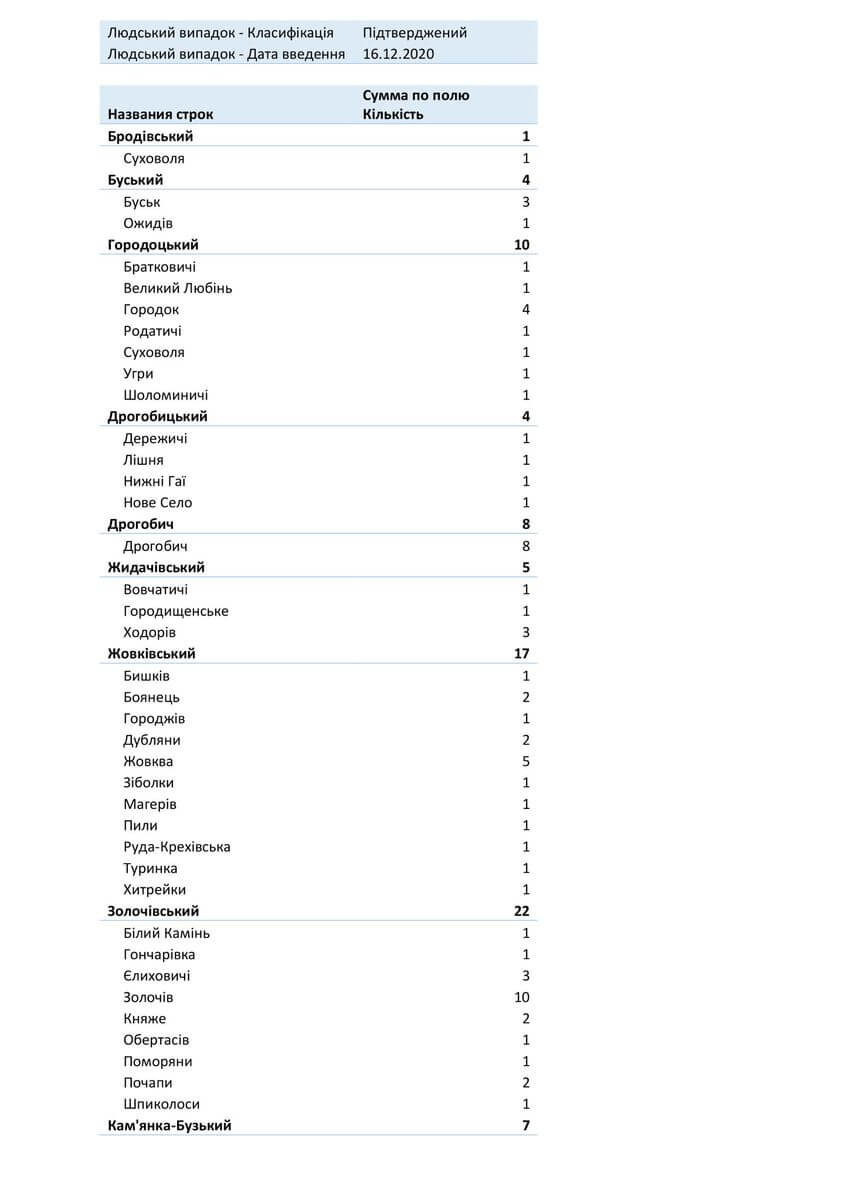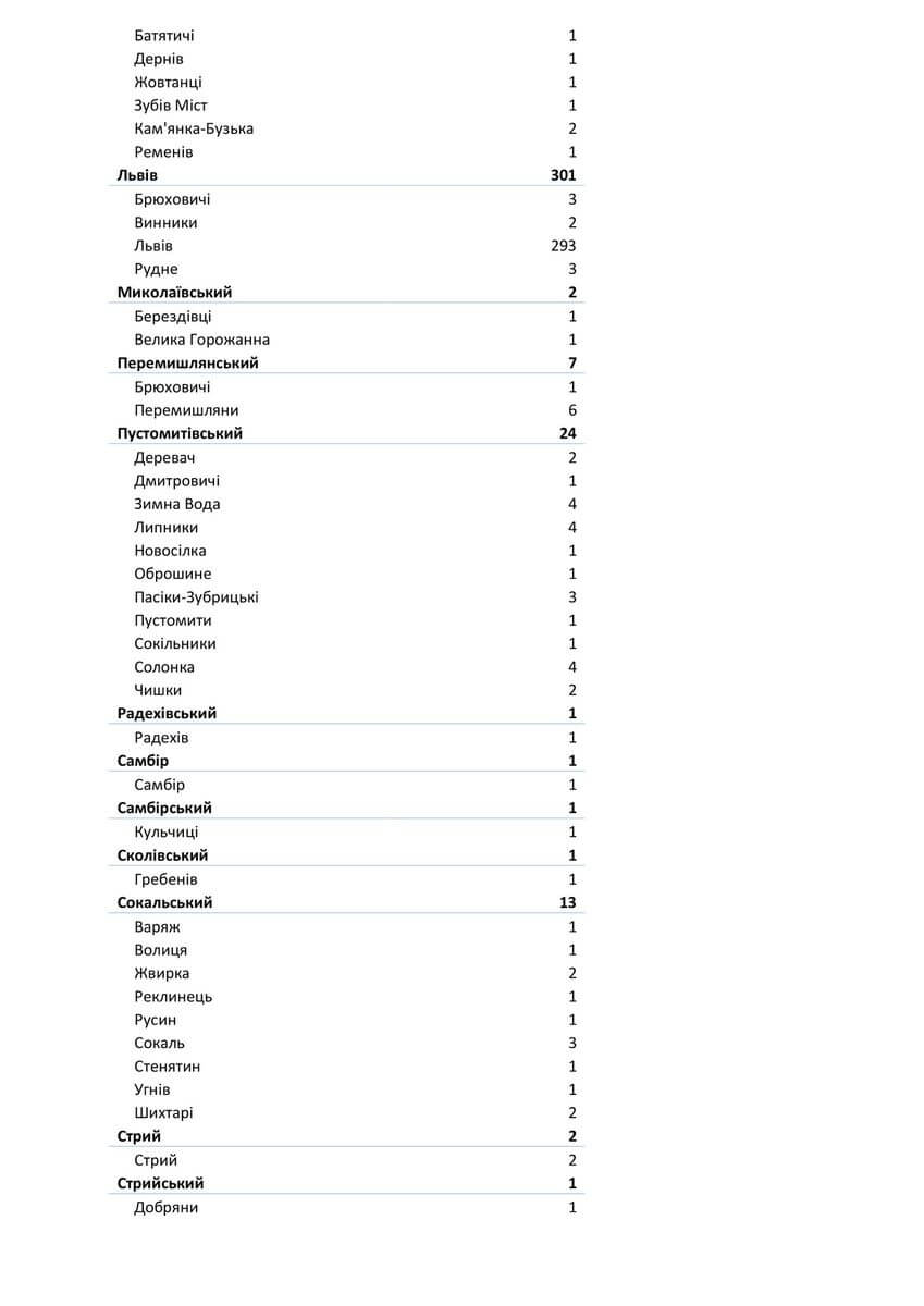 Знаходиться хворих в стаціонарах 1498, з них: у Львівській обласній інфекційній лікарні — 120 у Центрі легеневого здоров’я — 148 у Львівському обласному госпіталі ветеранів воєн та репресованих — 126 у Львівській обласній дитячій клінічній лікарні «ОХМАТДИТ» — 7 у ОКЛ — 38 у ЛШМД — 213 у 1 МКЛ — 84 у 5 МКЛ — 63 у 8 МКЛ — 96 у 1-му пологовому будинку — 14 у Львівській клінічній лікарні на ЗТ філії «ЦОЗ» АТ «Укрзалізниця» — 5 у Стрийській міській лікарні — 70 у Стебницькій міській лікарні — 39 у Рудківській лікарні — 49 у Новояворівській РЛ № 1 імені Юрія Липи — 99 у Кам’янка-Бузькій ЦРЛ — 40 у Сокальській ЦРЛ — 40 у Жовківській ЦРЛ — 38 у Жидачівській ЦРЛ — 43 у Самбірській ЦРЛ — 32 у Буській ЦРЛ — 39 у Пустомитівській ЦРЛ — 45 у Перемишлянській ЦРЛ — 50.