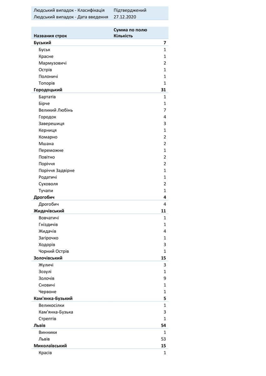 138 пацієнтів лікують у реанімаційних відділеннях. 30 — на ШВЛ. Знаходиться хворих в стаціонарах 1467, з них: у Львівській обласній інфекційній лікарні — 108, у Центрі легеневого здоров’я — 144, у Львівському обласному госпіталі ветеранів воєн та репресованих — 131, у Львівській обласній дитячій клінічній лікарні «ОХМАТДИТ» — 10, у ОКЛ — 31, у ЛШМД — 213, у 1 МКЛ — 61, у 5 МКЛ — 69, у 8 МКЛ — 91, у 1-му пологовому будинку — 9, у Львівській клінічній лікарні на ЗТ філії «ЦОЗ» АТ «Укрзалізниця» — 16, у Стрийській міській лікарні — 70, у Стебницькій міській лікарні — 36, у Рудківській лікарні — 47, у Новояворівській РЛ № 1 імені Юрія Липи — 93, у Кам’янка-Бузькій ЦРЛ — 49, у Сокальській ЦРЛ — 37, у Жовківській ЦРЛ — 39, у Жидачівській ЦРЛ — 39, у Самбірській ЦРЛ — 28, у Буській ЦРЛ — 42, у Пустомитівській ЦРЛ — 49, у Перемишлянській ЦРЛ — 55.