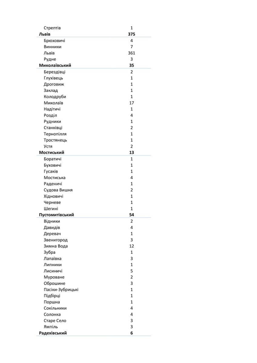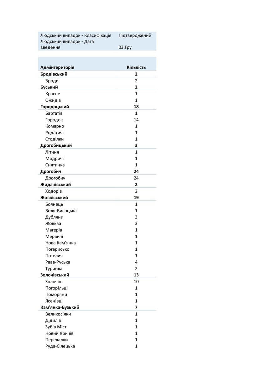 Знаходиться хворих в стаціонарах 1657, з них: у Львівській обласній інфекційній лікарні — 116 у Центрі легеневого здоров’я — 144 у Львівському обласному госпіталі ветеранів воєн та репресованих — 153 у Львівській обласній дитячій клінічній лікарні «ОХМАТДИТ» — 12 у ОКЛ — 27 у ЛШМД — 260 у 1 МКЛ — 79 у 5 МКЛ — 107 у 8 МКЛ — 102 у 1-му пологовому будинку — 12 у Стрийській міській лікарні — 87 у Стебницькій міській лікарні — 53 у Рудківській лікарні — 37 у Новояворівській РЛ № 1 імені Юрія Липи — 111 у Кам’янка-Бузькій ЦРЛ — 44 у Сокальській ЦРЛ — 39 у Жовківській ЦРЛ — 49 у Жидачівській ЦРЛ — 53 у Самбірській ЦРЛ — 28 у Буській ЦРЛ — 40 у Пустомитівській ЦРЛ — 43 у Перемишлянській ЦРЛ — 61.
