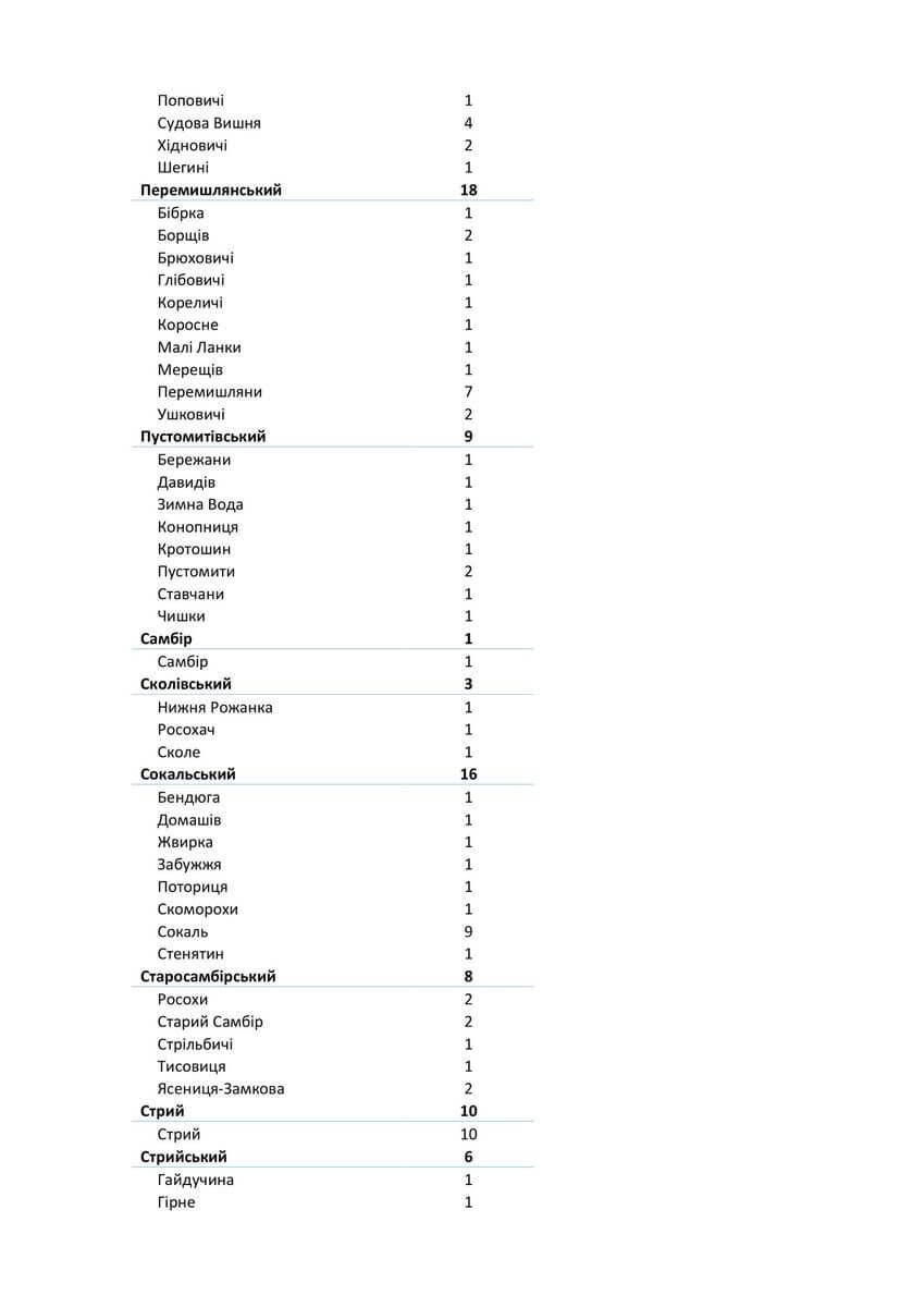 Знаходиться хворих в стаціонарах 1569, з них: у Львівській обласній інфекційній лікарні — 107, у Центрі легеневого здоров’я — 141 у Львівському обласному госпіталі ветеранів воєн та репресованих — 144, у Львівській обласній дитячій клінічній лікарні «ОХМАТДИТ» — 17, у ОКЛ — 30, у ЛШМД — 237, у 1 МКЛ — 82, у 5 МКЛ — 90, у 8 МКЛ — 107, у 1-му пологовому будинку — 11, у Стрийській міській лікарні — 77, у Стебницькій міській лікарні — 61, у Рудківській лікарні — 42, у Новояворівській РЛ № 1 імені Юрія Липи — 99, у Кам’янка-Бузькій ЦРЛ — 42, у Сокальській ЦРЛ — 42, у Жовківській ЦРЛ — 37, у Жидачівській ЦРЛ — 45, у Самбірській ЦРЛ — 29, у Буській ЦРЛ — 38, у Пустомитівській ЦРЛ — 40, у Перемишлянській ЦРЛ — 51.