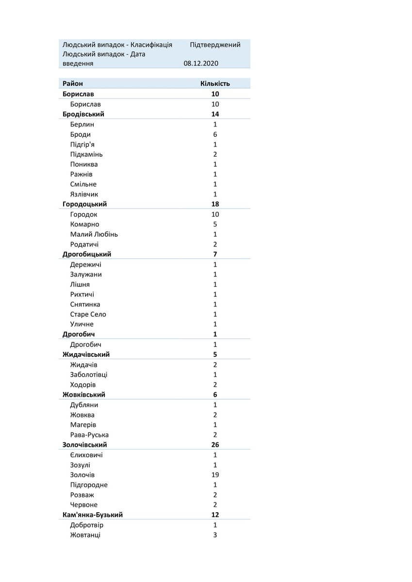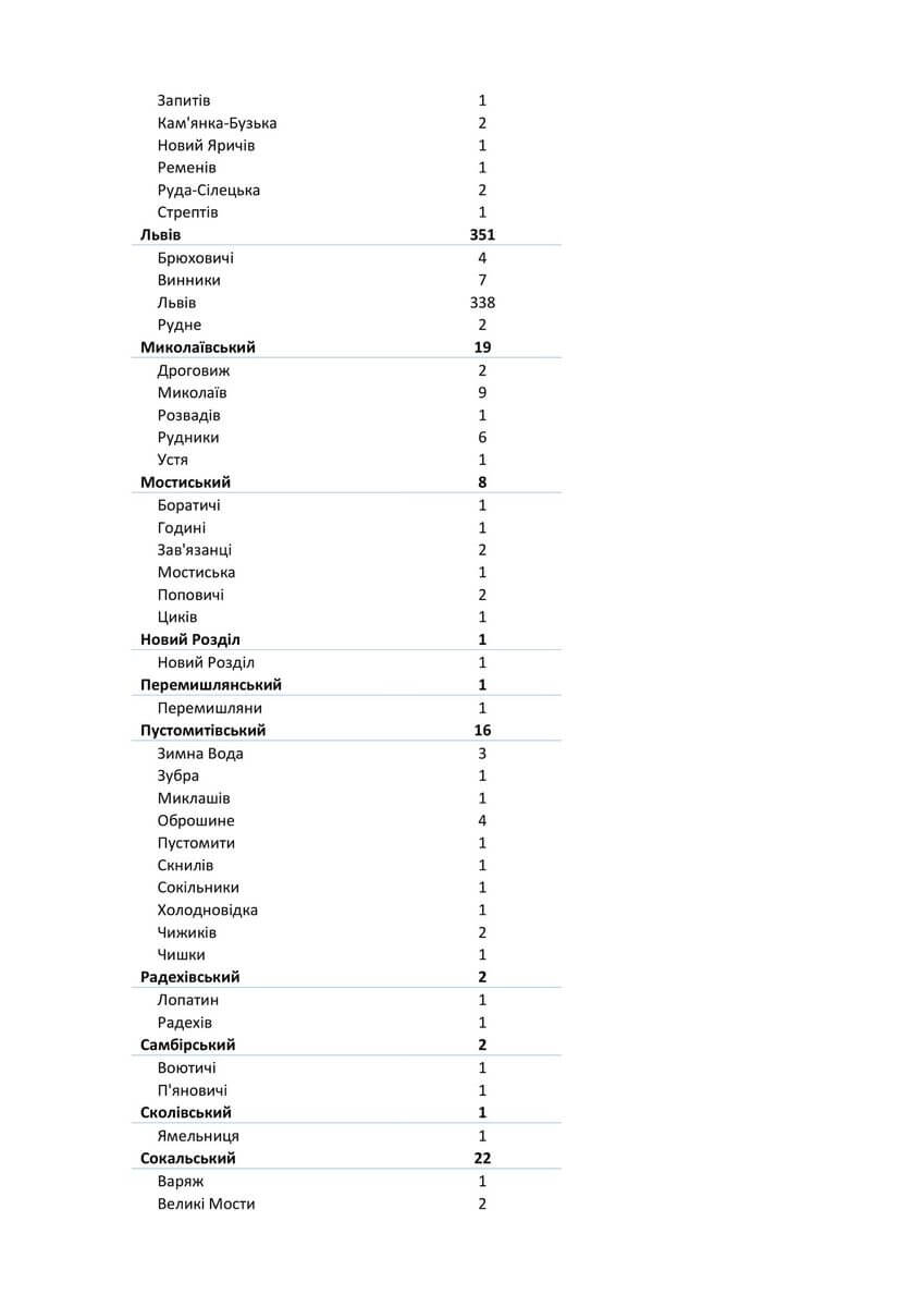 Знаходиться хворих в стаціонарах 1541, з них: у Львівській обласній інфекційній лікарні — 105, у Центрі легеневого здоров’я — 133, у Львівському обласному госпіталі ветеранів воєн та репресованих — 140, у Львівській обласній дитячій клінічній лікарні «ОХМАТДИТ» — 15, у ОКЛ — 34, у ЛШМД — 233, у 1 МКЛ — 81, у 5 МКЛ — 83, у 8 МКЛ — 106, у 1-му пологовому будинку — 13 у Стрийській міській лікарні — 81, у Стебницькій міській лікарні — 59, у Рудківській лікарні — 41, у Новояворівській РЛ № 1 імені Юрія Липи — 95, у Кам’янка-Бузькій ЦРЛ — 38, у Сокальській ЦРЛ — 43, у Жовківській ЦРЛ — 36, у Жидачівській ЦРЛ — 41, у Самбірській ЦРЛ — 29, у Буській ЦРЛ — 39, у Пустомитівській ЦРЛ — 43, у Перемишлянській ЦРЛ — 54.