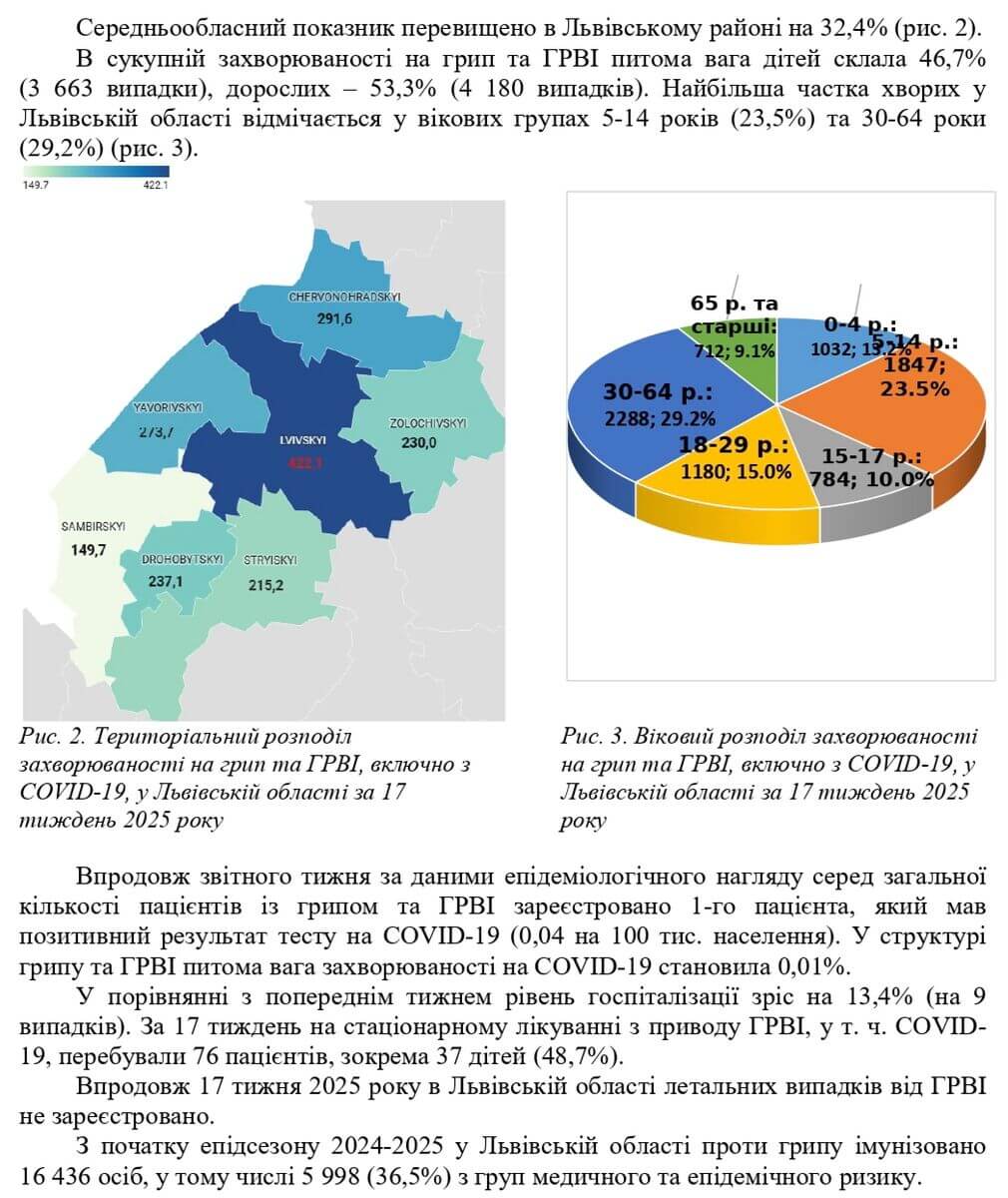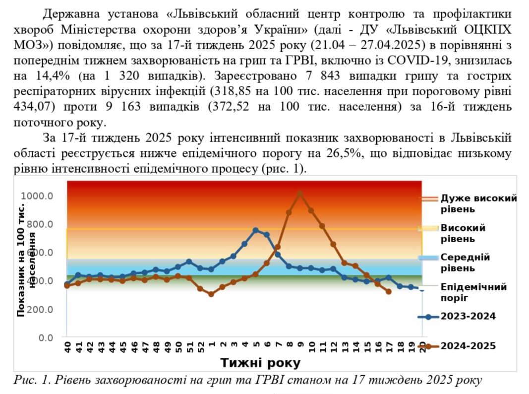 Державна установа «Львівський обласний центр контролю та профілактики хвороб Міністерства охорони здоров’я України» оприлюднила інформацію щодо захворюваності на грип та ГРВІ, включно із COVID-19, у Львівській області за 17-й тиждень 2025 року (21.04 – 27.04.2025).