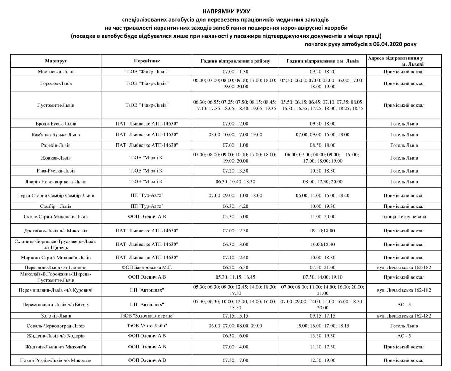 Графік руху спеціалізованих автобусів для перевезень працівників медичних закладів