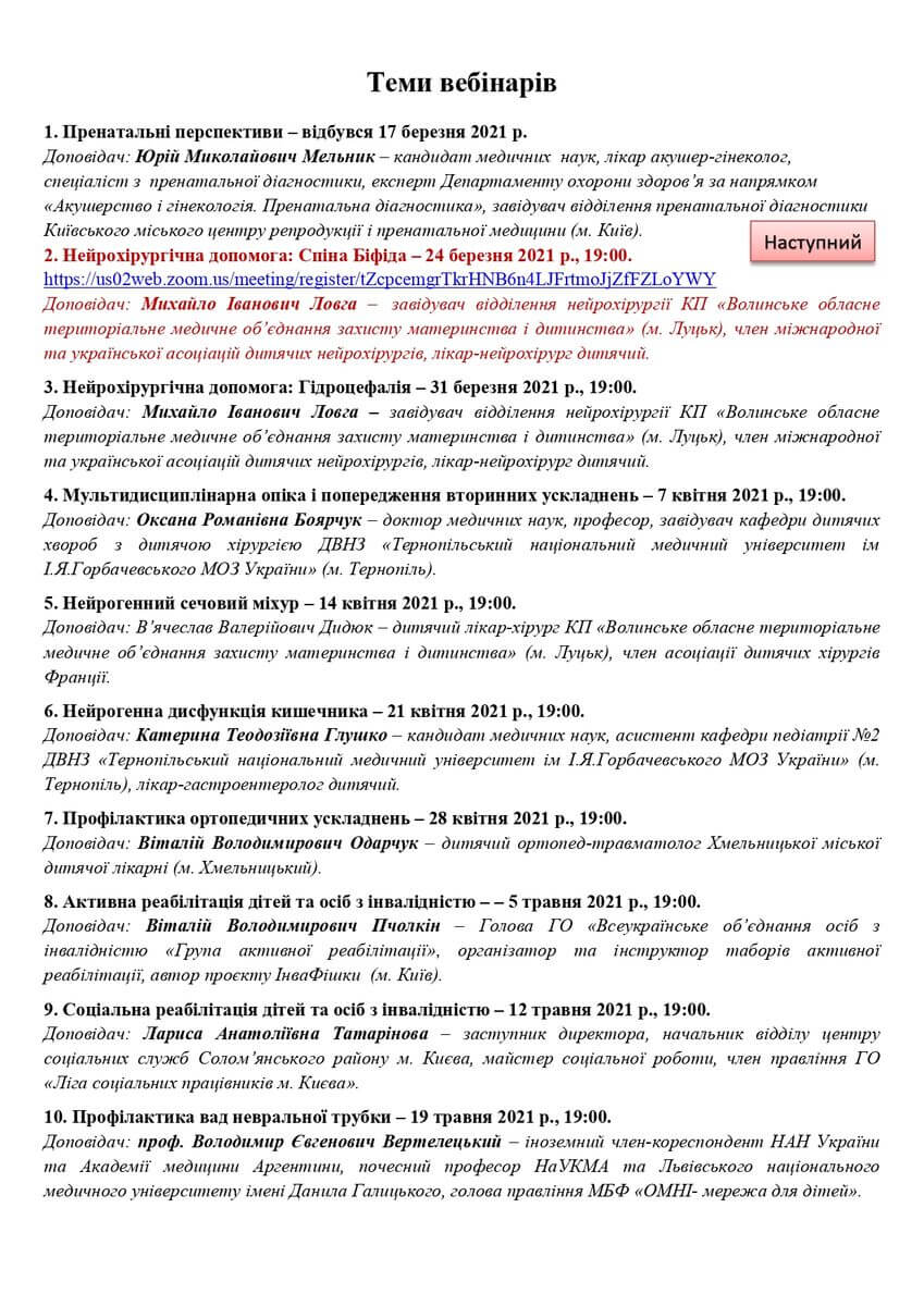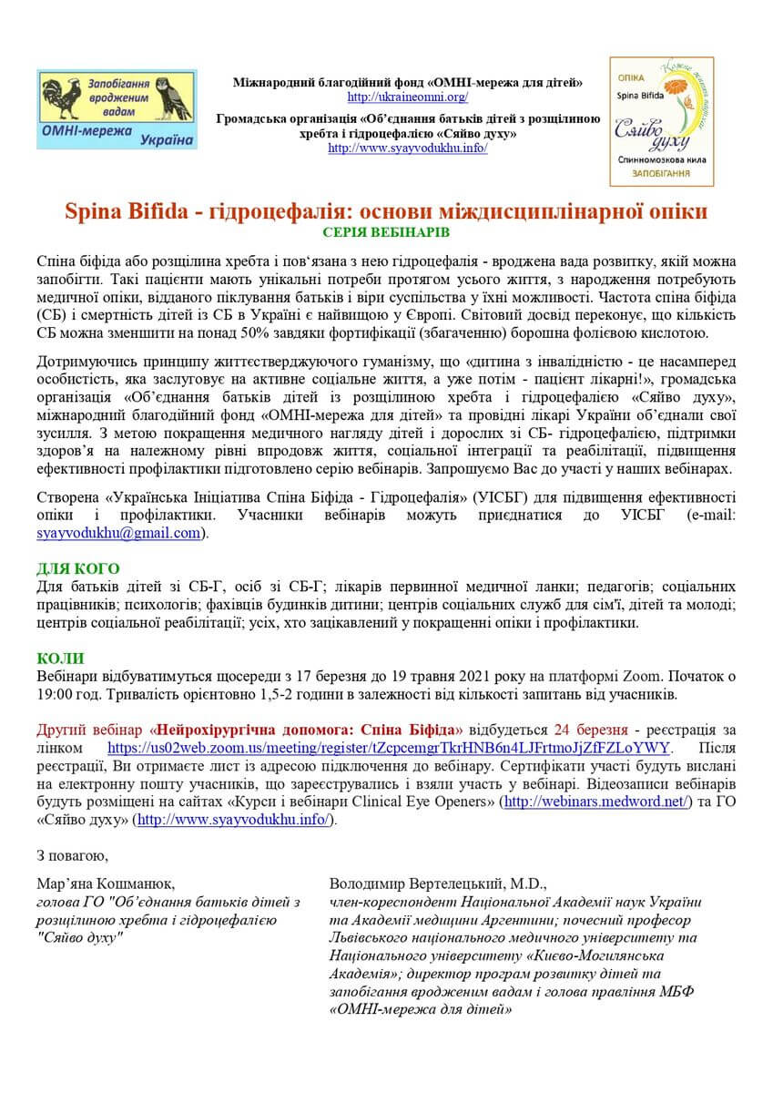 Запрошуємо взяти участь у другому вебінарі «Нейрохірургічна допомога: Спіна Біфіда» із серії «Spina Bifida — гідроцефалія: основи міждисциплінарної опіки», який відбудеться 24 березня 2021 року о 19:00 на платформі Zoom.