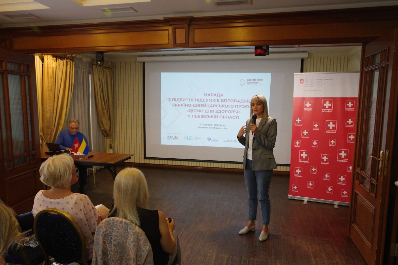 27 вересня 2024 року у Львові відбулася нарада з підбиття підсумків впровадження україно-швейцарського проєкту «Діємо для здоров’я» в Львівській області за чотири роки. Захід зібрав представників місцевих органів влади, фахівців у сфері охорони здоров’я, освітян та громадських активістів, щоб поділитися результатами роботи в межах проєкту, а також напрацювати плани і рекомендації у сфері профілактики та контролю НІЗ на наступний проєктний період.