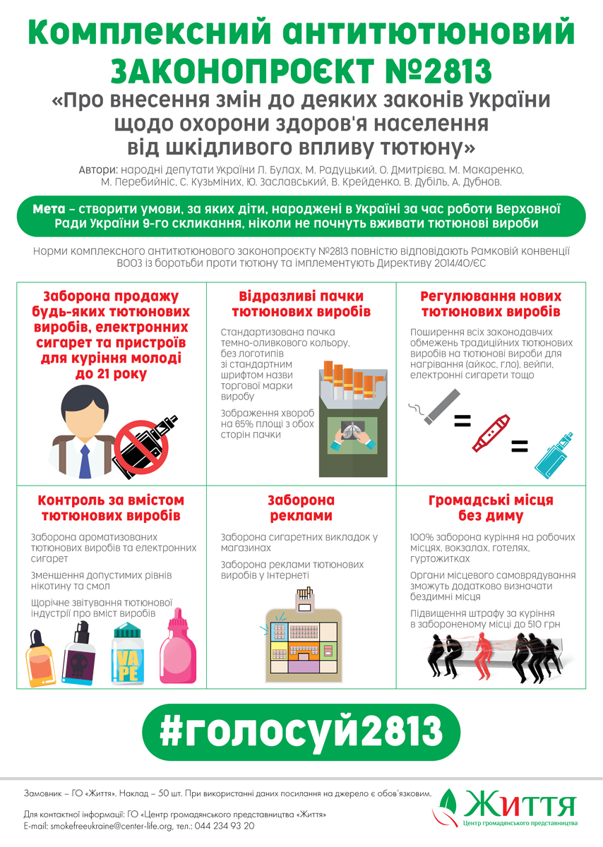 В кінці січня було зареєстровано комплексний антитютюновий законопроєкт № 2813 «Про внесення змін до деяких законів України щодо охорони здоров’я населення від шкідливого впливу тютюну».