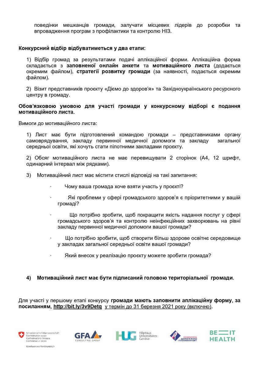 Для участі у першому етапі конкурсу громади мають заповнити АПЛІКАЦІЙНУ ФОРМУ, за ПОСИЛАННЯМ, у термін до 31 березня 2021 року (включно).