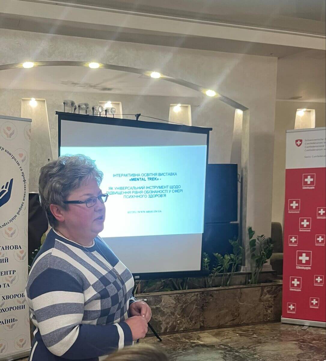 Мар'яна Служинська, координаторка Україно-швейцарського проєкту "Діємо для здоров'я" у Львівській області, виступила з вітальним словом та окреслила роль Проєкту у профілактиці неінфекційних захворювань серед мешканців Самбірщини та важливість впровадження превентивних заходів.