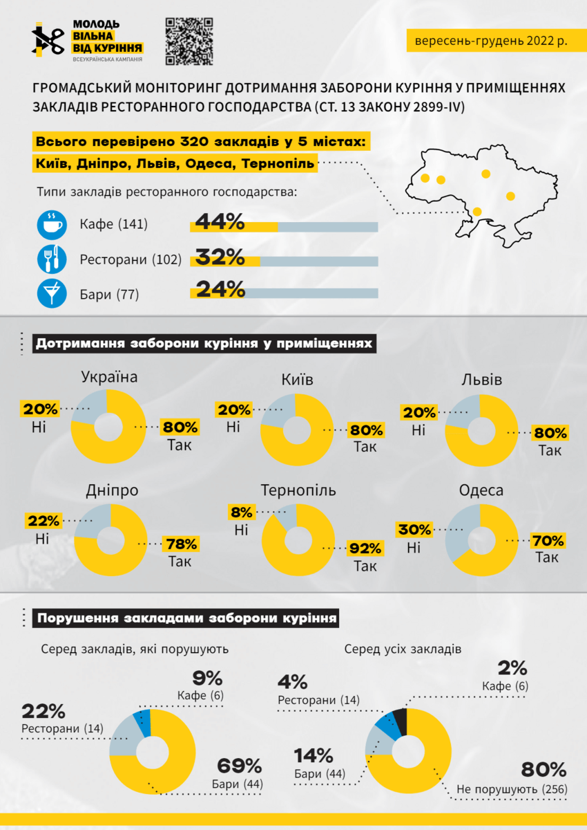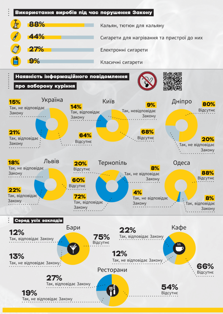 Результати моніторингу показали, що загалом по Україні 80% кафе, барів та ресторанів дотримуються заборони куріння усіх видів тютюнових виробів, використання пристроїв для нагрівання та кальянів всередині своїх приміщень. Для порівняння у Львові цей показник складає також 80%.