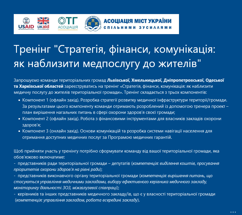 Тренінг організовується та проводиться проектом USAID «Підтримка реформи охорони здоров’я» за підтримки Асоціації міст України та Всеукраїнської асоціації ОТГ.