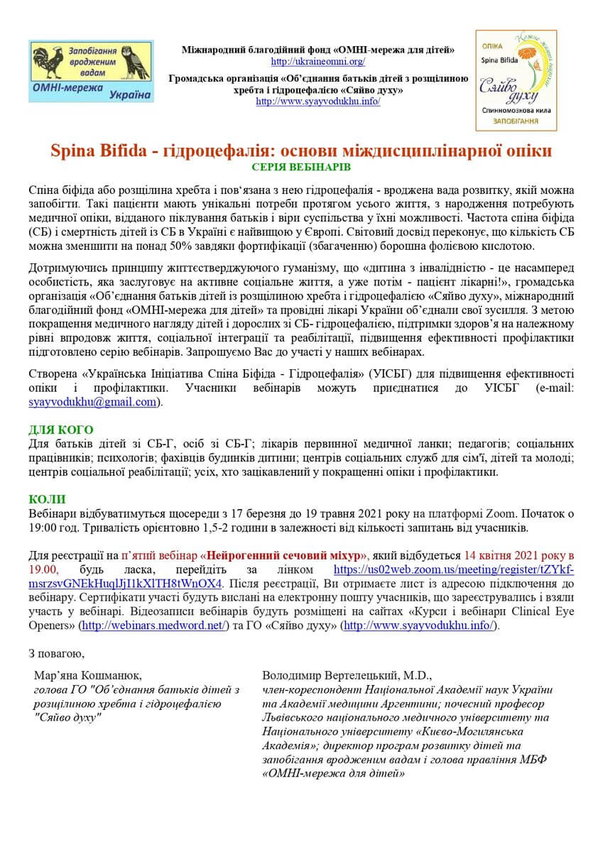 Запрошуємо Вас взяти участь у п’ятому вебінарі «Нейрогенний сечовий міхур» із серії «Spina Bifida — гідроцефалія: основи міждисциплінарної опіки», який відбудеться 14 квітня 2021 року о 19:00 на платформі Zoom.