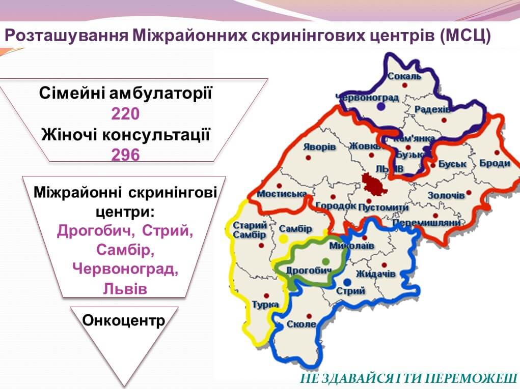 Завдяки субпроєкту "Онкопревенція та впровадження ефективних протипухлинних технологій у Львівській області" створена мережа міжрайонних скринінгових центрів, де за скеруванням сімейного лікаря можна пройти СКРИНІНГОВЕ ОБСТЕЖЕННЯ — мамографію, а також цитологічне дослідження для ранньої діагностики раку шийки матки.